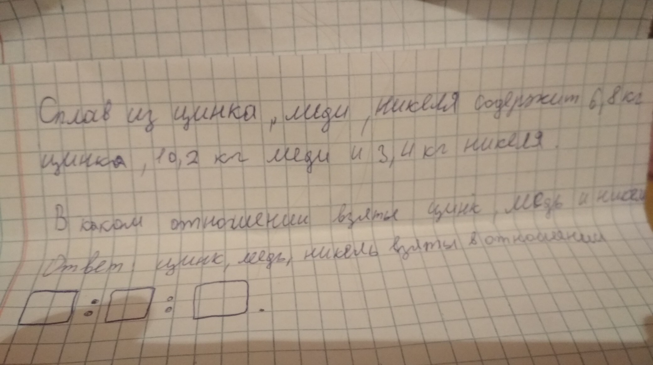 Делим вес цинка, меди и никеля на найменьший из них (3,4кг)