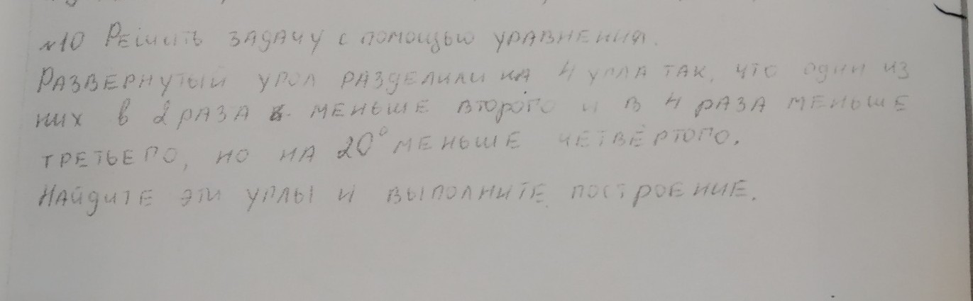Развёрнутый угол разделим на 4 угла так, что один из них в 2 раза меньше второго и в 4 раза меньше третьего, но на 20° меньше четвёртого.
