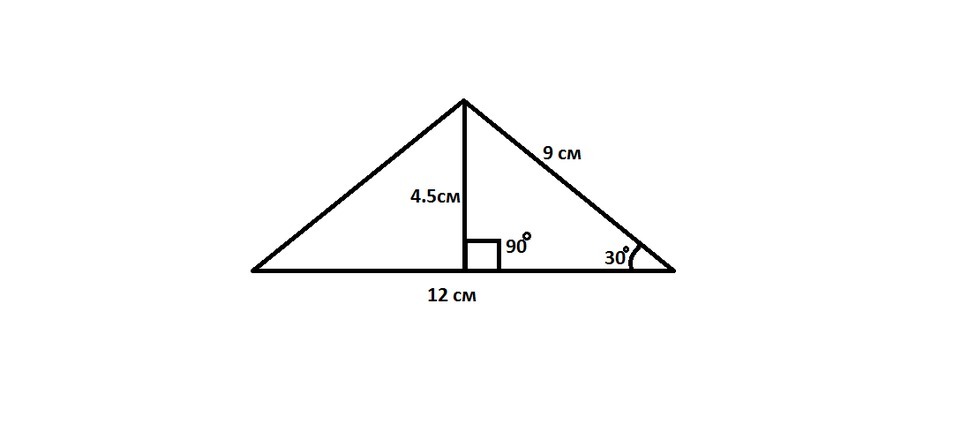 Построим высоты из вершины А, что бы найти площадь треугольника. Получим ВСТ с гипотинузой 9 см, и углом прилежащей к ней в 30 градусов, следовательно ТВ=4.5 см, т.к. катет лежащий на против угла в 30 градусов в 2 раза меньше гипотенузы. Находим площадь по формуле S=1/2*ah, S=1/2* 4.5*12=27 см2.