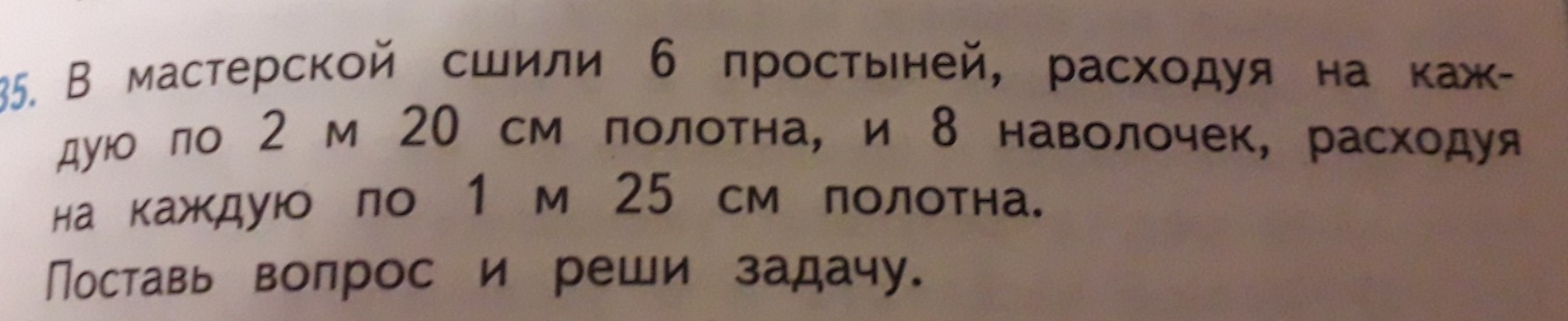 в мастерской сшили 6 простыней расходуя на каждую по 2 М 20 см полотна, и 8 наволочек, расходуя на каждую по одному метру 25 см полотна. Поставь вопрос и реши задачу. с условием.