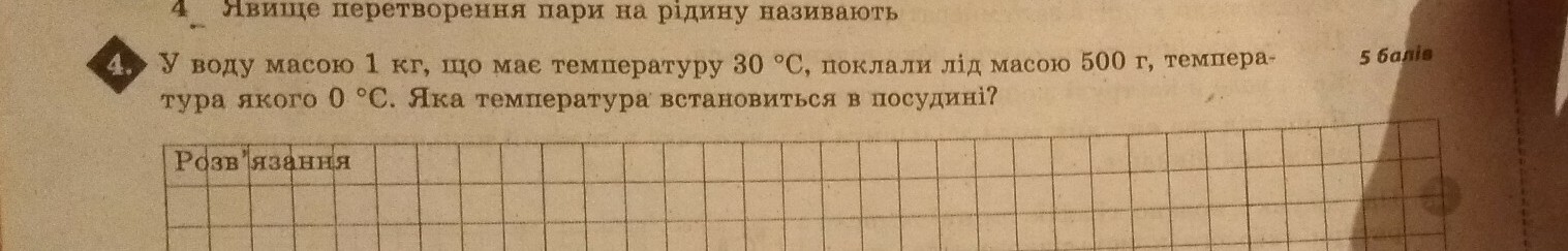 У воду масою 1 кг, що має температуру 30°С, поклали лід масою 500 г, температура якого 0°С. яка температура встановиться в посудині??