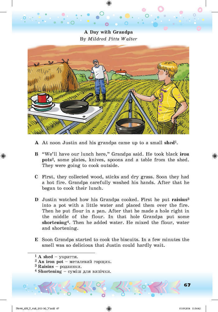 "Мы пообедаем тут" - сказал дедушка. Он взял черные железные горшки, несколько тарелок, ложки и стол из сарая. Они собирались готовить на улице.