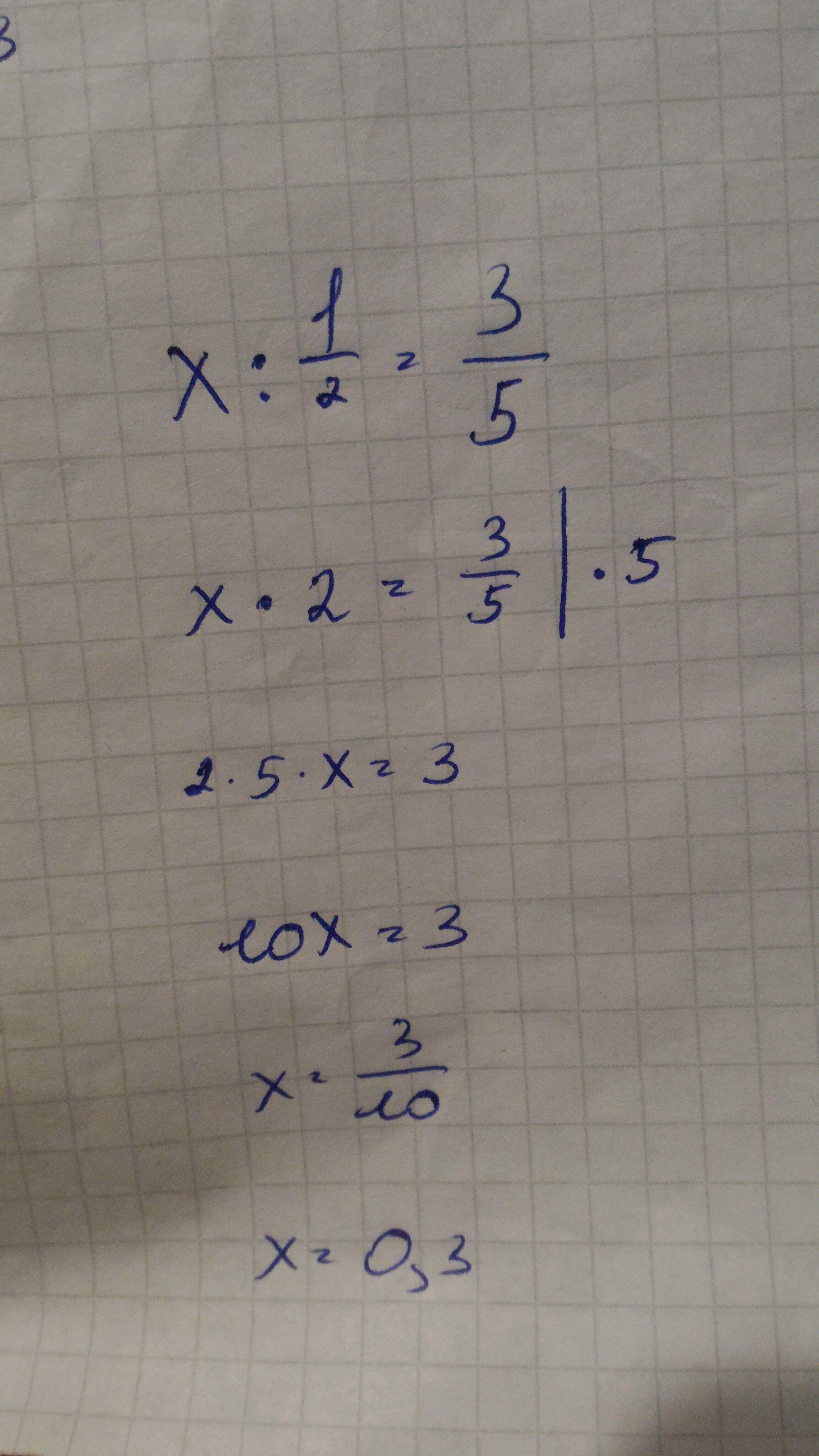 Умножаем обе стороны на 5. Получается 10х=3(мы это сделали, чтобы избежать сложного деления)