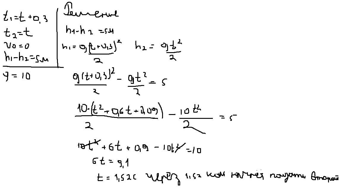 Два тела начали свободно падать с одной и той же высоты. Одно вслед за другим через 0,3 с. Через какое время расстояние между телами станет равным 5 метрам.