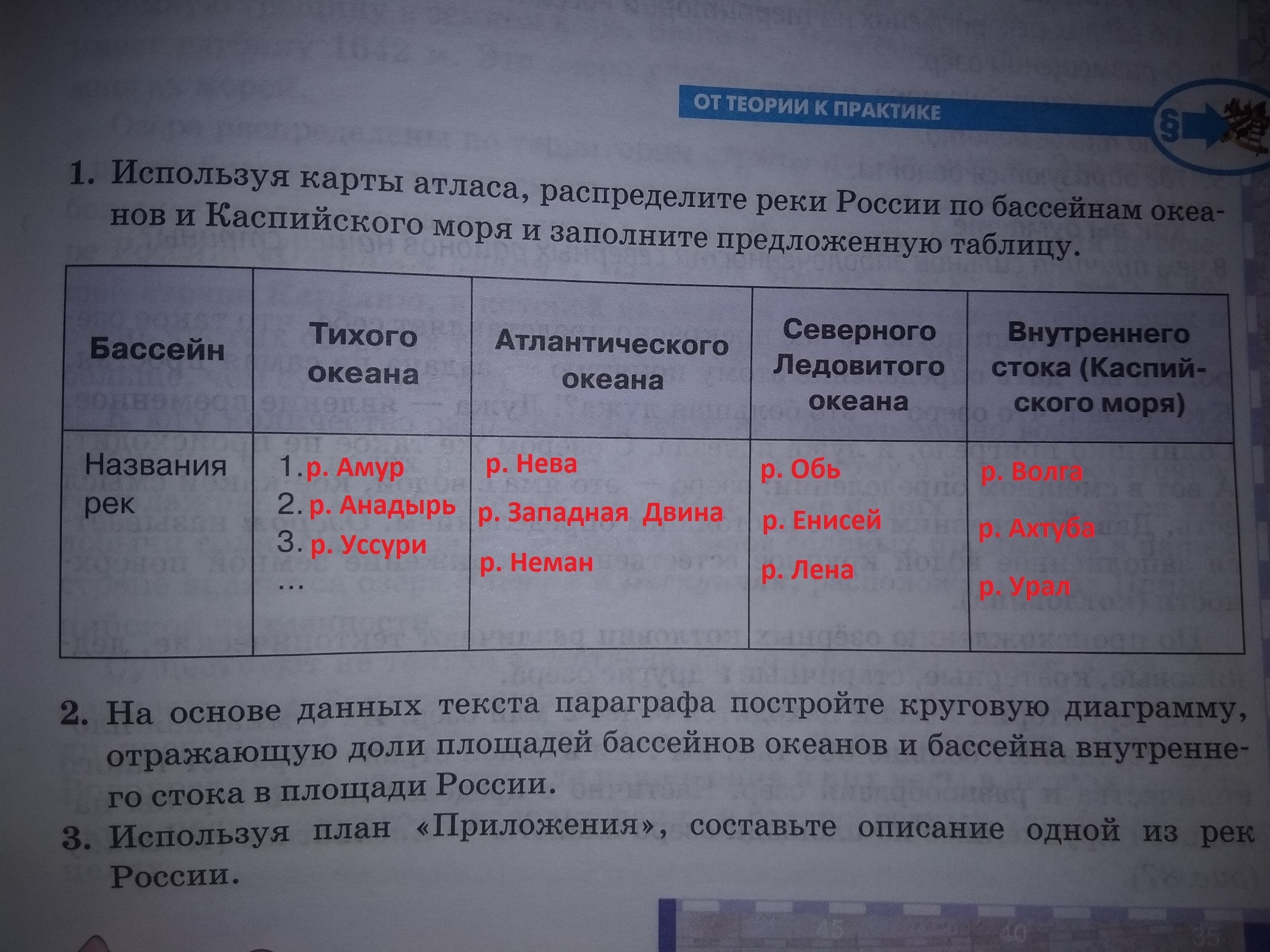 используя карты атласа Распределите реки России по бассейнам океанов и Каспийского моря и заполните предложенную таблицу