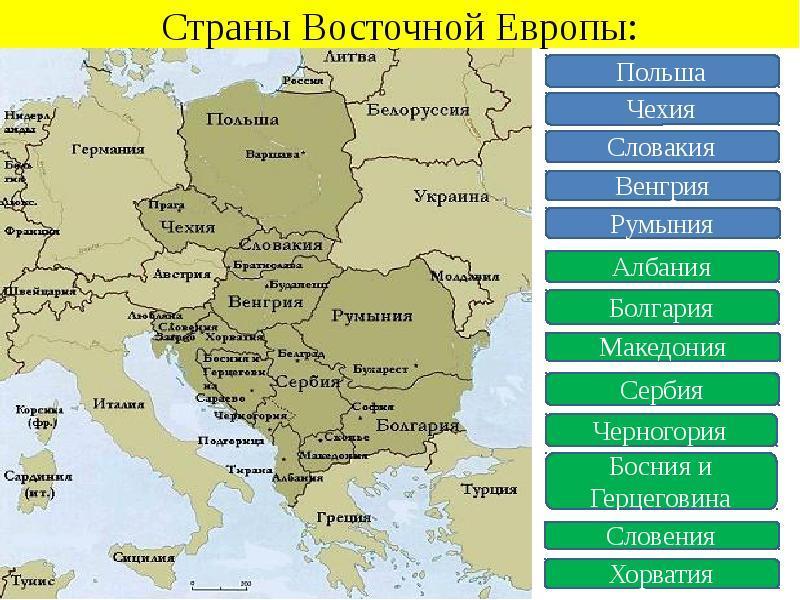 Объяснение: Это страны Балтии Польша Германия Чехословакия Венгрия Румыния Страны бывшей Югославии и Болгария