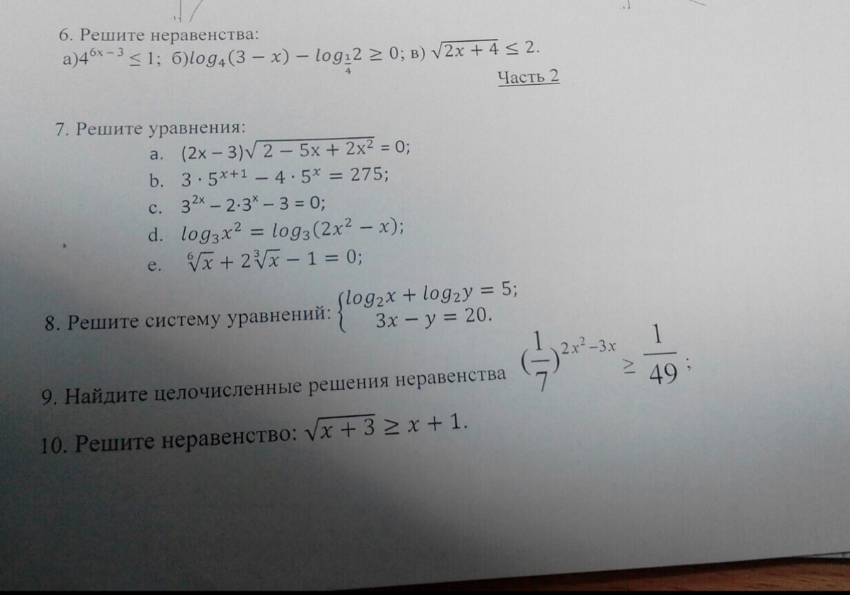 6) 4^6x-3<=4^0 6x-3<=0 x>=0,5 b)log4(3-x)+log4(2)>=0 log4(6-2x)>=log4(1),6-2x>=1 , 2x<=5, x<=2,5 в)2x+4<=4 ,2x<=0, x<=0 но при этом