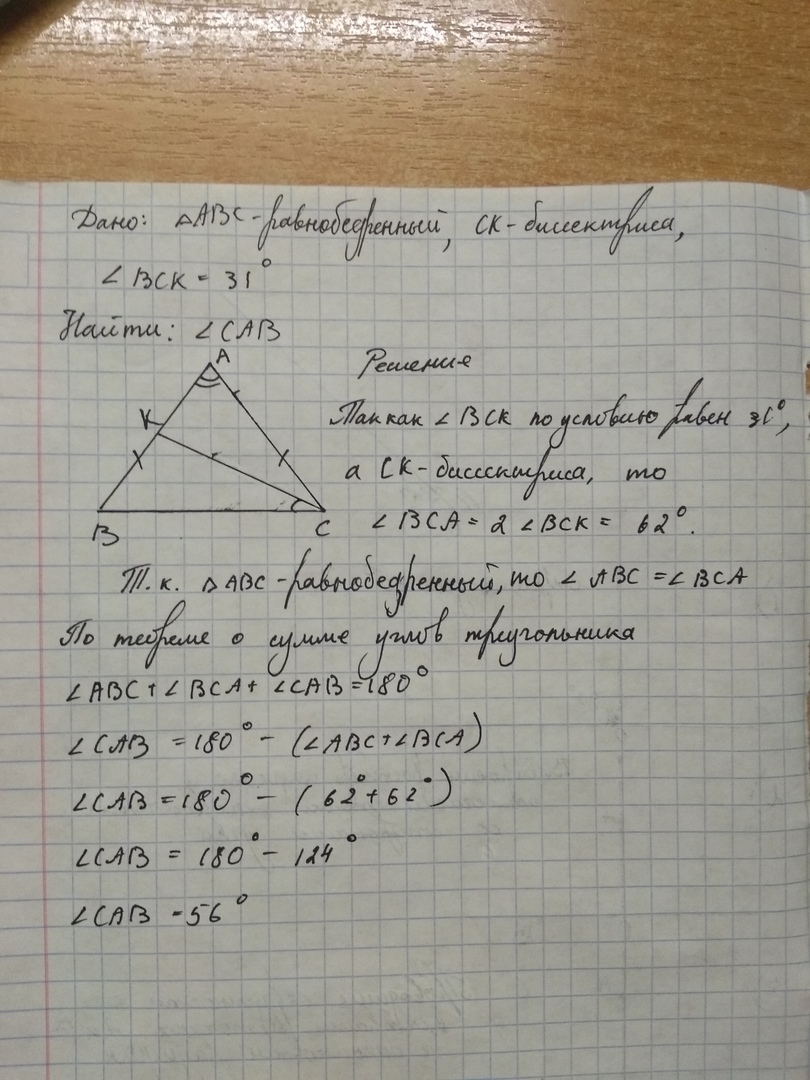 Дан равнобедренный треугольник авс с основанием BC и биссектрисой CK найдите величину угла CAB если угол BCK =31 ГРАДУС