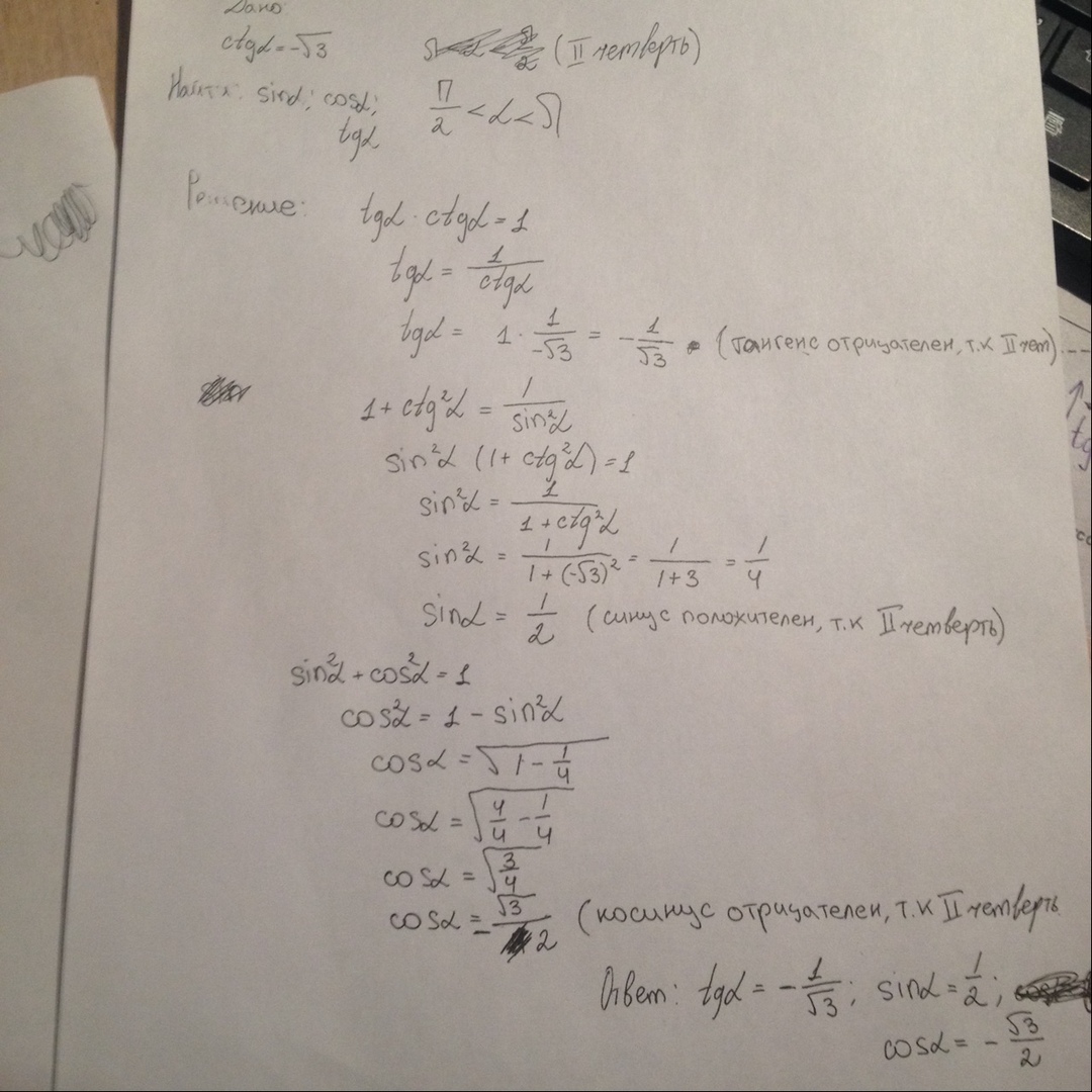 найти неизвестные тригонометрические функции угла, если ctg = -√3, а угол α лежит во второй четверти.