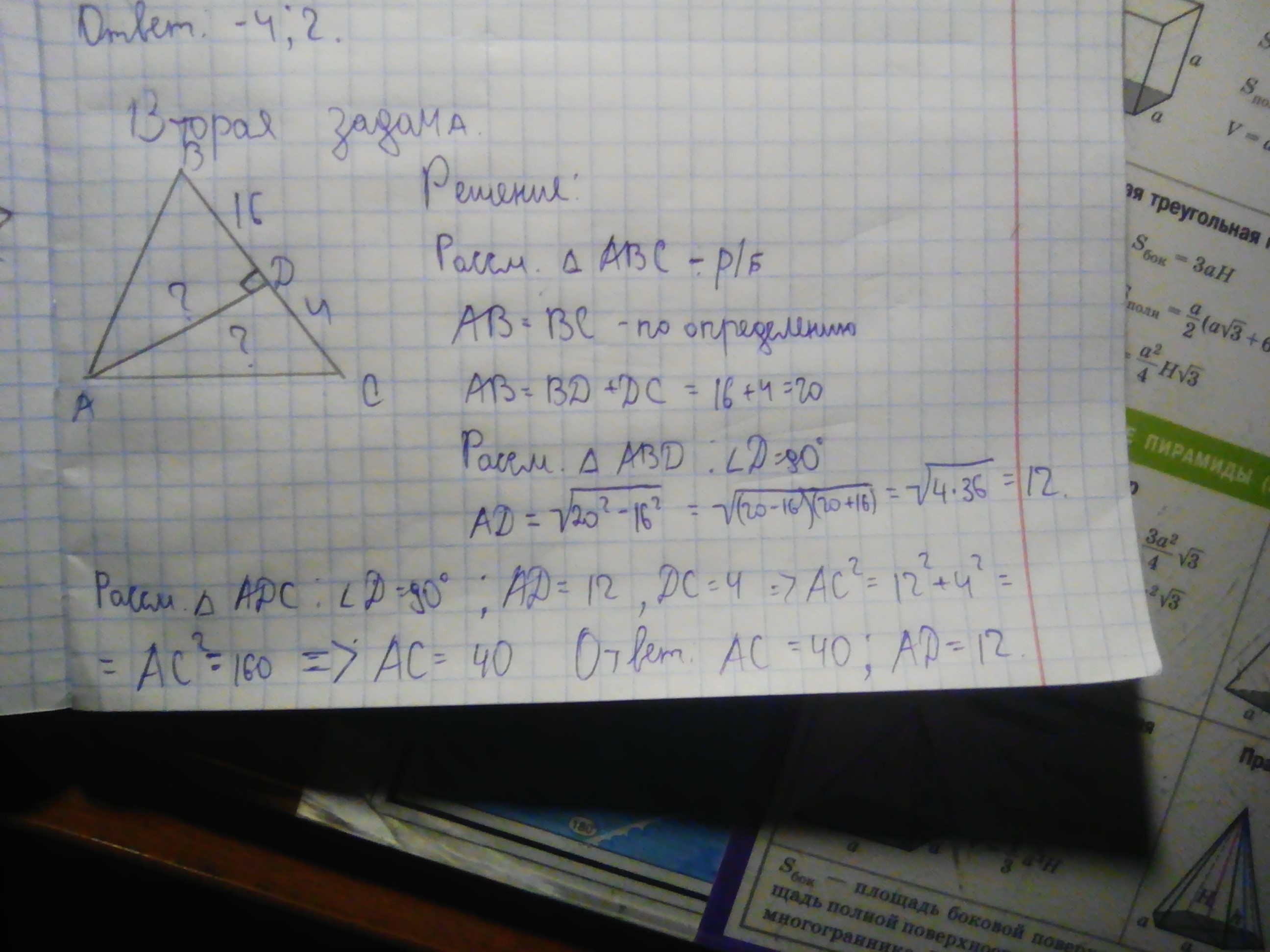 2) в тр-ке АВД АВ=20, ВД=16 АД^2=АВ^2--АД^2=400-256=144, АД=12, из тр-каАДС АС^2=АД^2+ДС ^2=144+16=160, АС=V160=4V10