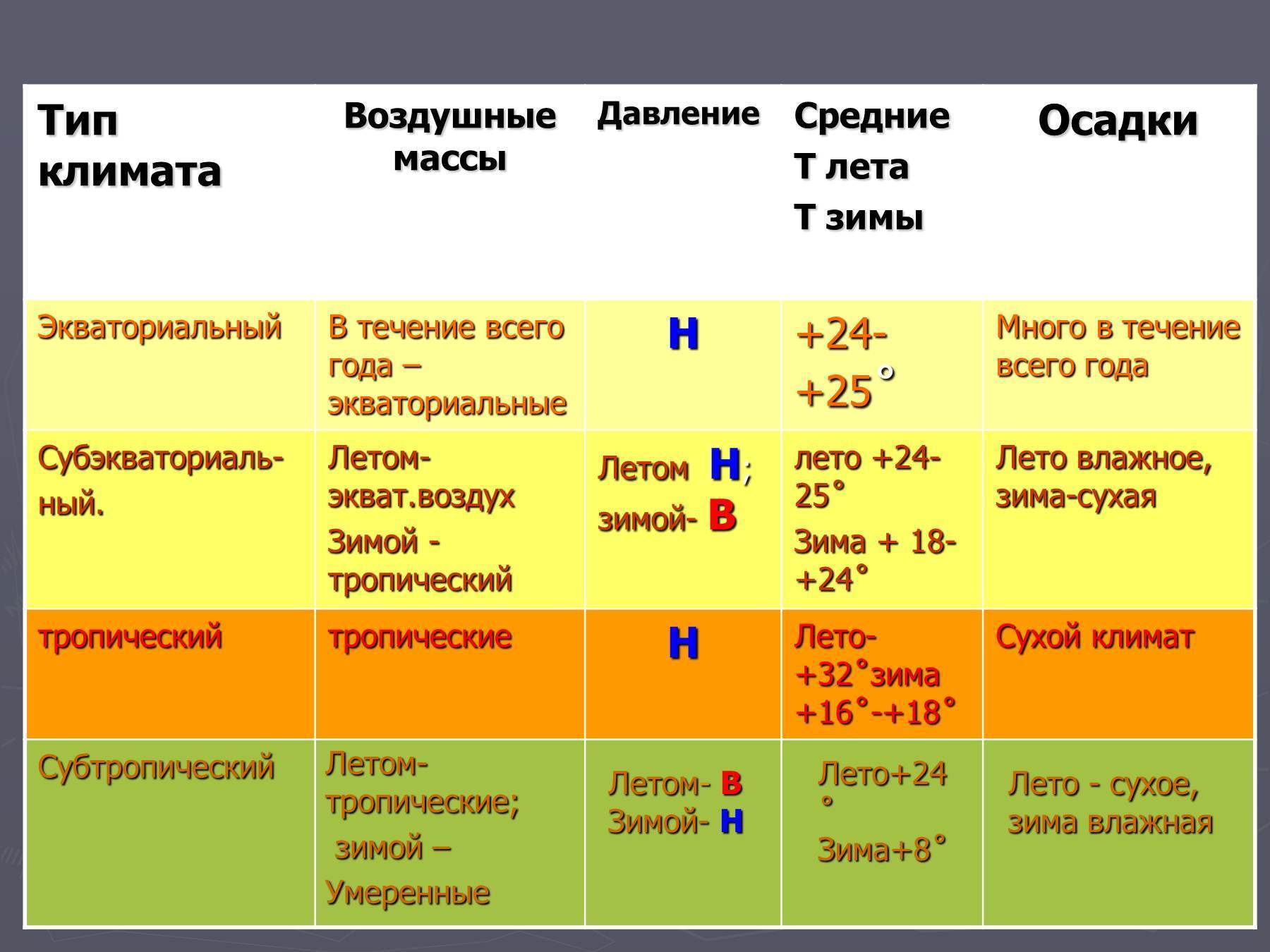 Типы воздушных масс: В течении всего года экваториальные +24,+25
