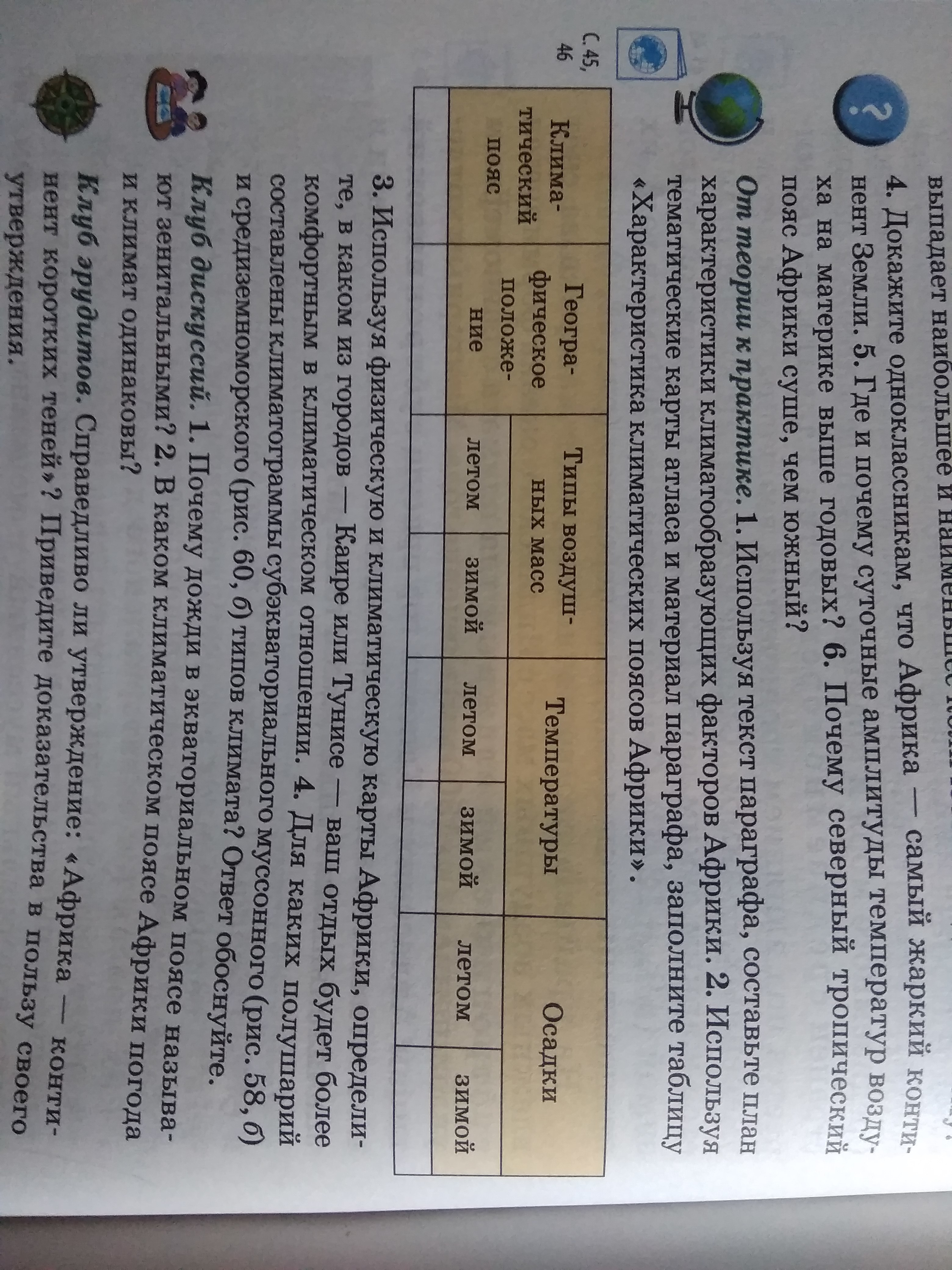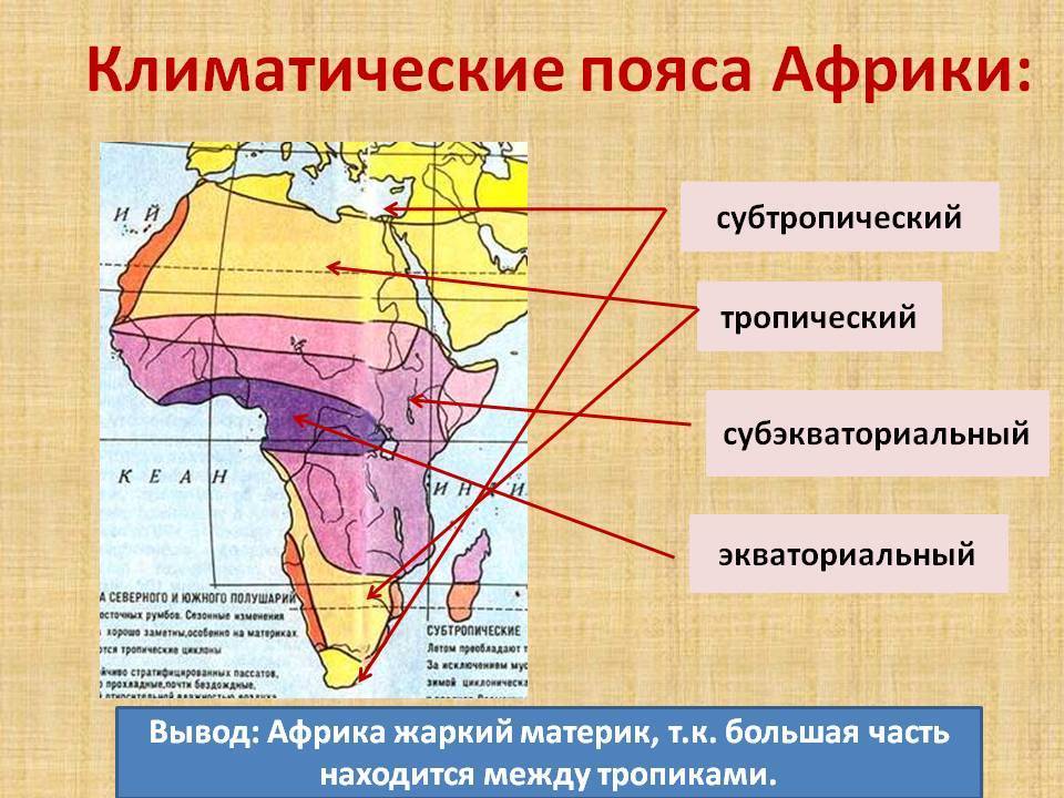 Климатические пояса: Африка находиться в 2-ух субэкваториальных, 2 субтропических, 1 тропическом и в 1 экваториальном
