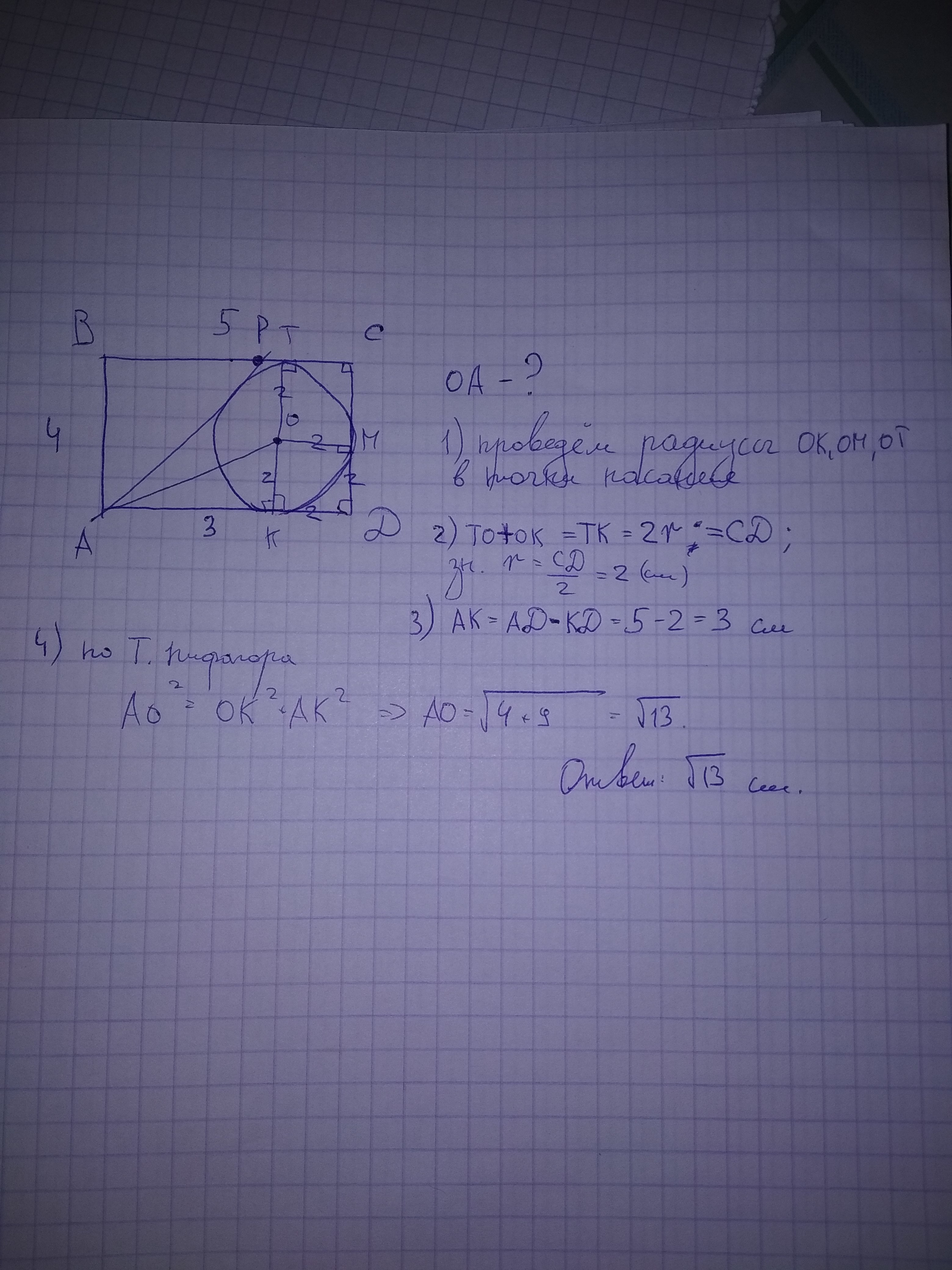 В прямоугольнике ABCD AB=4 и BC = 5. Точка Р - внутреняя точка отрезка BC. В четырехугольник APCD вписана окружность. Вычислите расстояние от центра окружности до точки А.