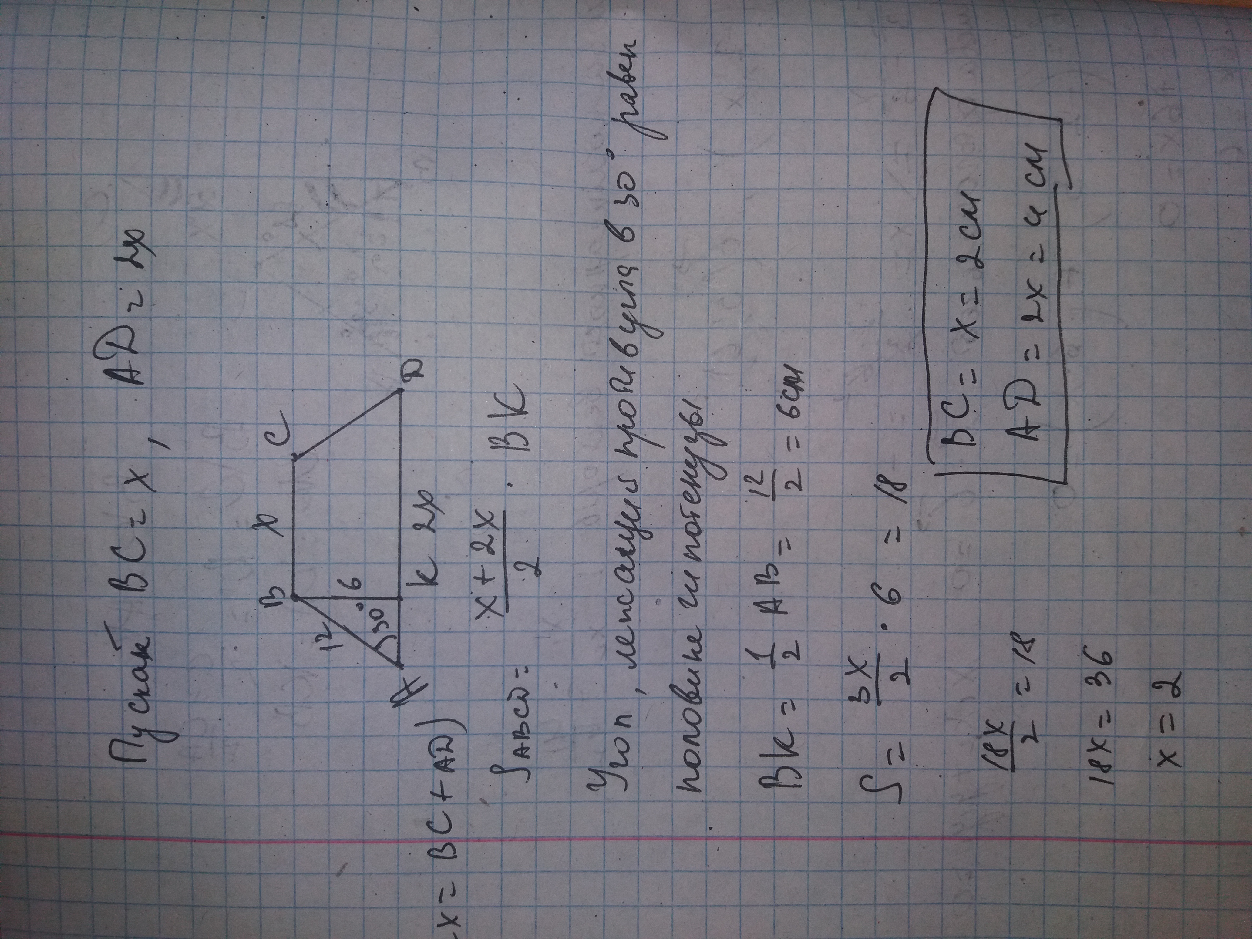 Так же известно, что гипотенуза прямоугольного треугольника с углом 30° больше катета который образует этот угол=> катет = 12:2=6= высота ( катет треугольников являлся высотой трапеции). Тогда по формуле S(трапеции)= ((а+b):2) •h ; можно сказать что 18 см= (а+b):2 •6; (a+b):2=3;а+b= 6; если b = 2a, то a + b= 3a; 3a=6; a= 2 b = 2•2=4. Ответ: 2 см; 4 см