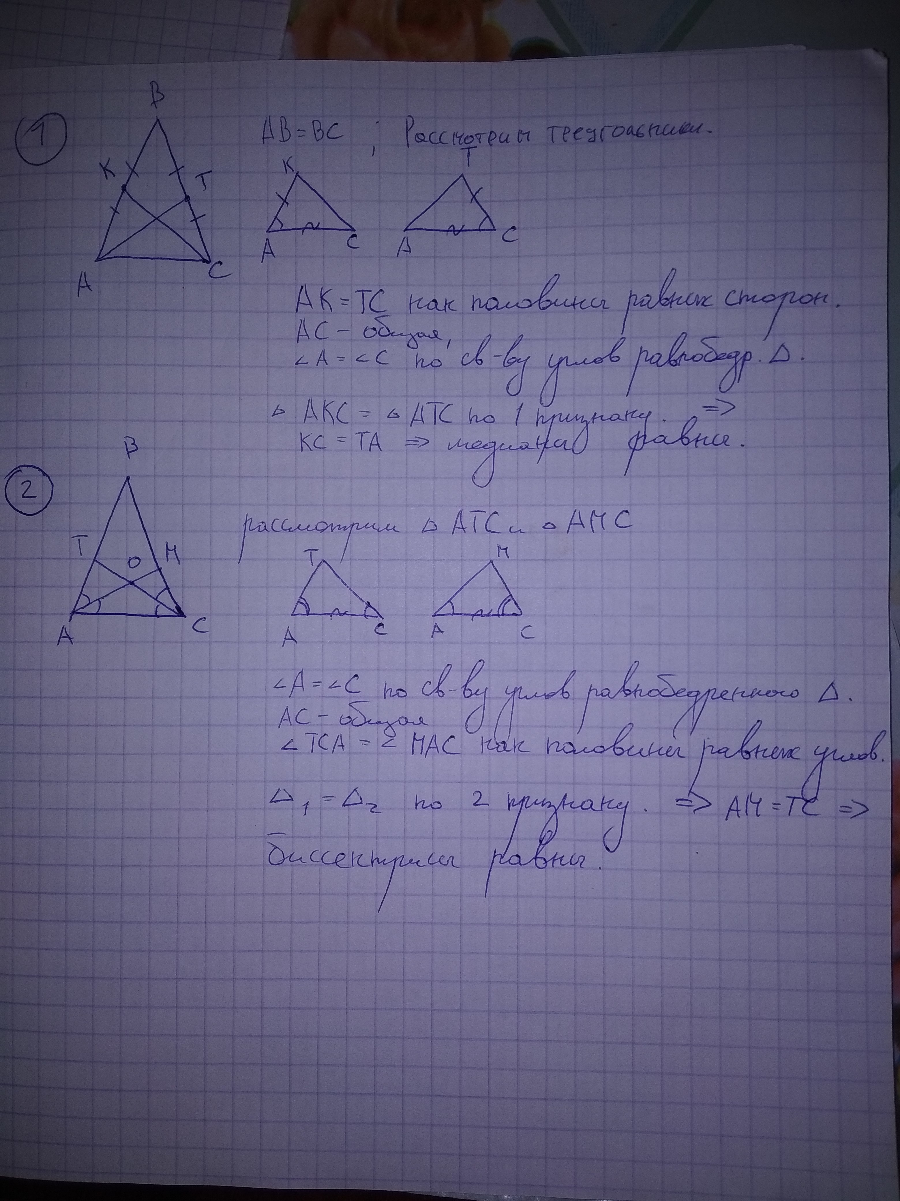 1. Докажите что в равнобедренном треугольнике медианы проведенные из вершины основания равны