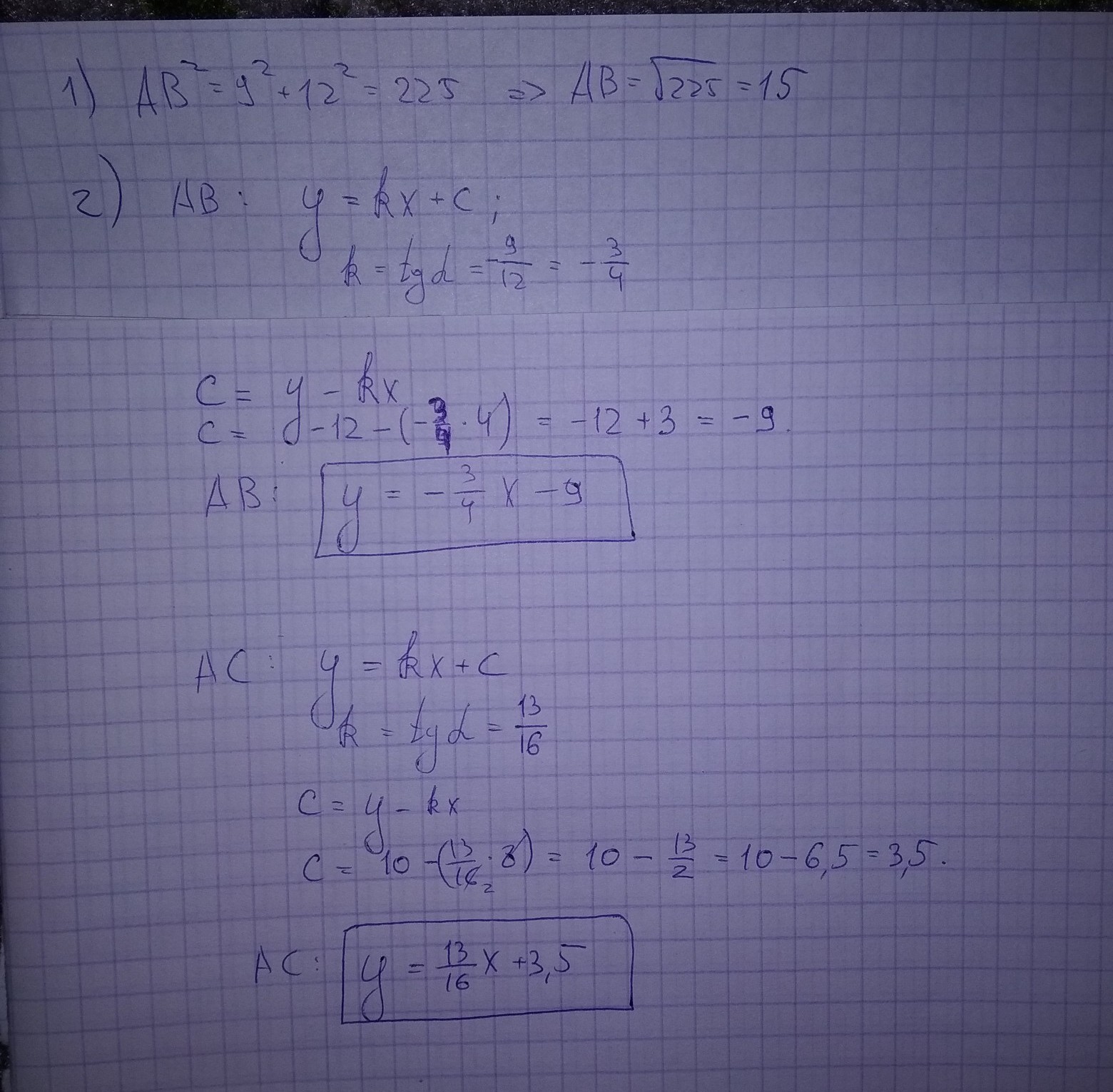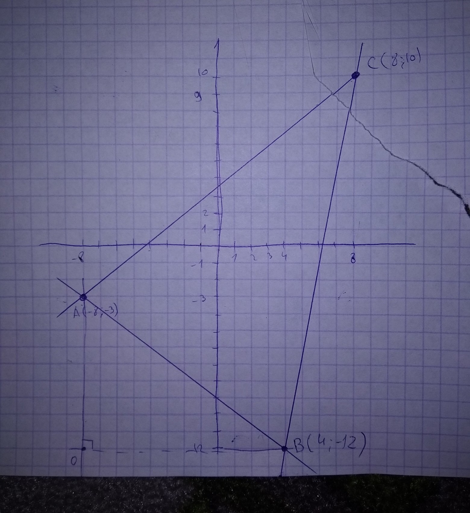 Можете помочь с рисункой нужно?! Даны коррдинаты вершин треугольника ABC. A(-8;-3), B(4;-12), C(8;10). Найти: 1) длину сторон AB; 2)уравнения прямых AB,AC.