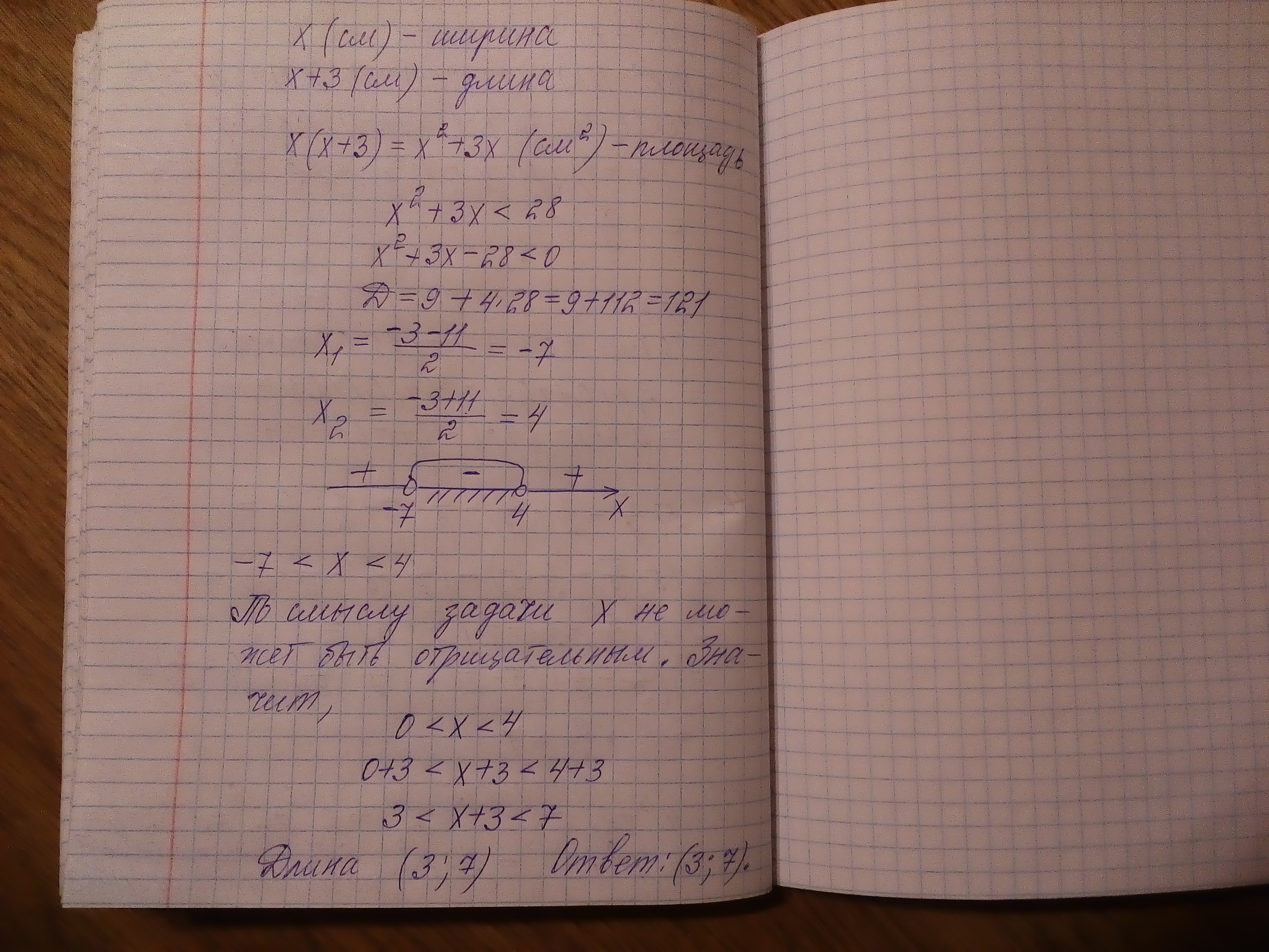 Длина прямоугольника на 3 см больше ширины.Какую длину должен иметь прямоугольник,чтобы его площадь была меньше 28см2
