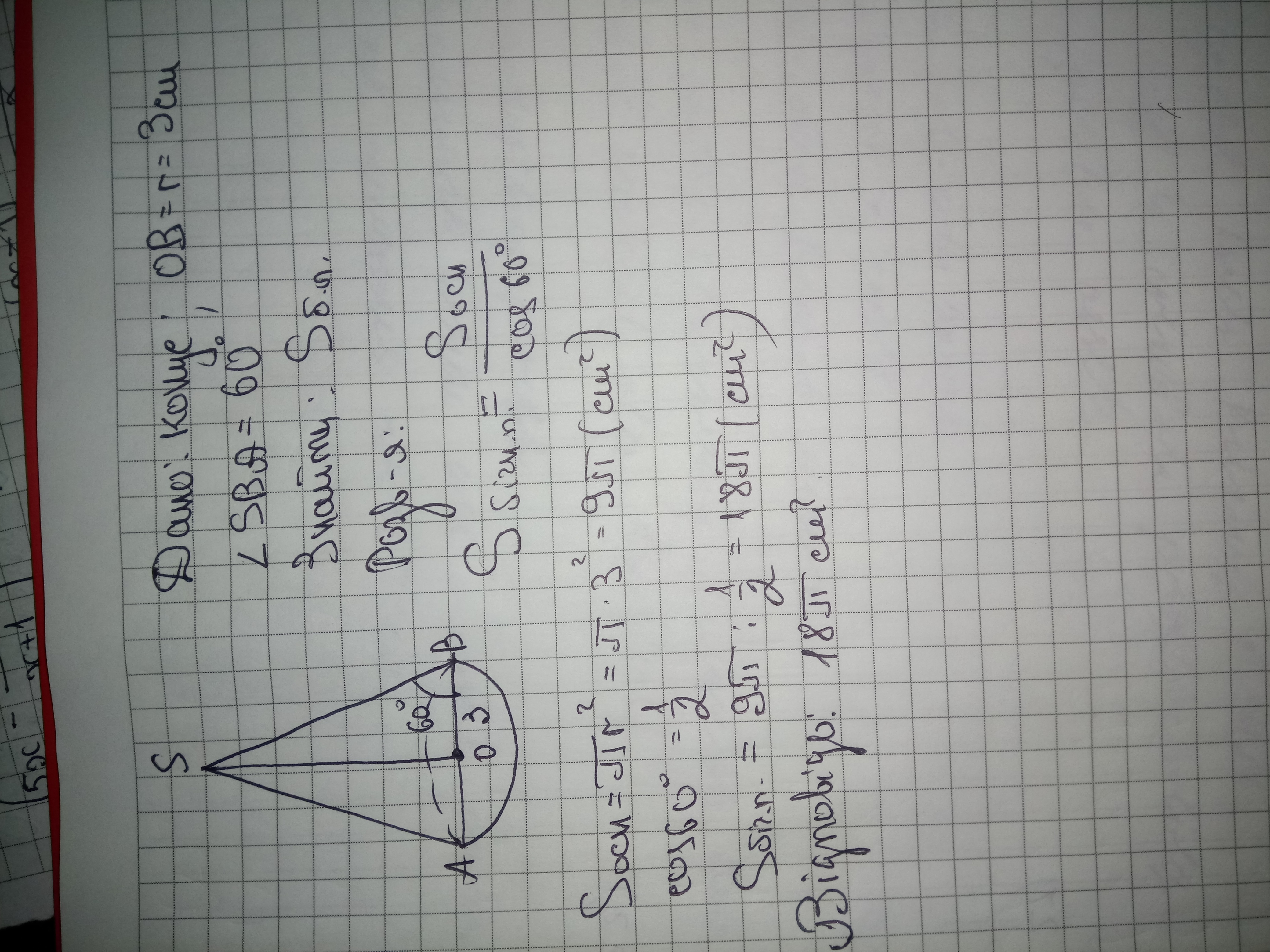 знайдіть площу бічної поверхні конуса якщо радіус його основи дорівнює корінь з 3 см, а твірна нахилена до площини основи під кутом 60 градусів