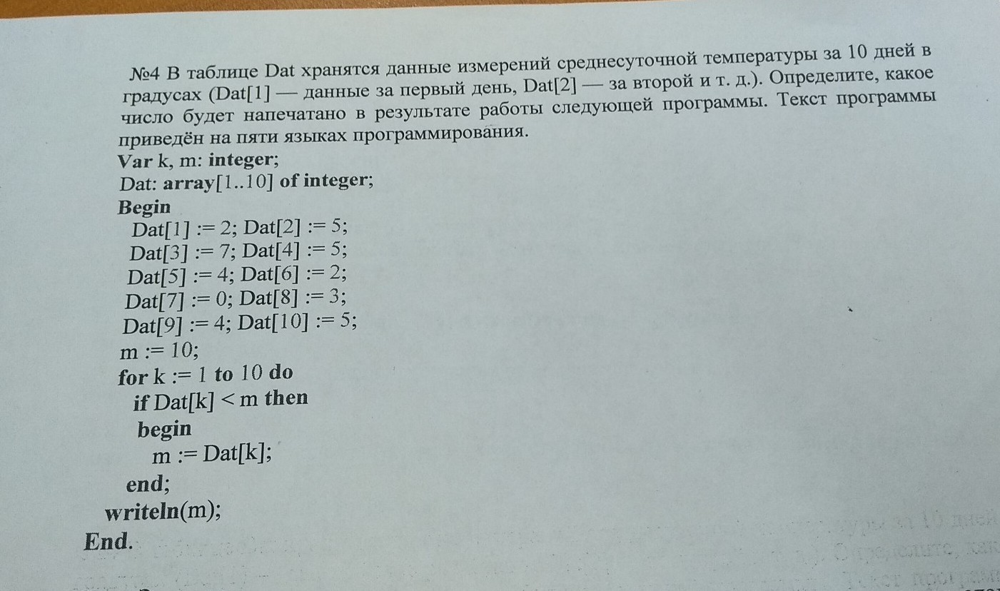 Будет напечатано число 7, так как программа написанная ,говорит о том , что если число К мень М то надо присвоить М значение К, тут нет полного решения, нужно понимать это. Идёшь по порядку