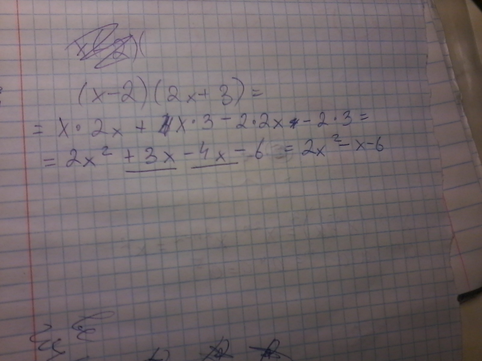 Получается х*2х+3*х-2*2х-2*3=2х^2+3х-4х-6=2х^2-х-6
