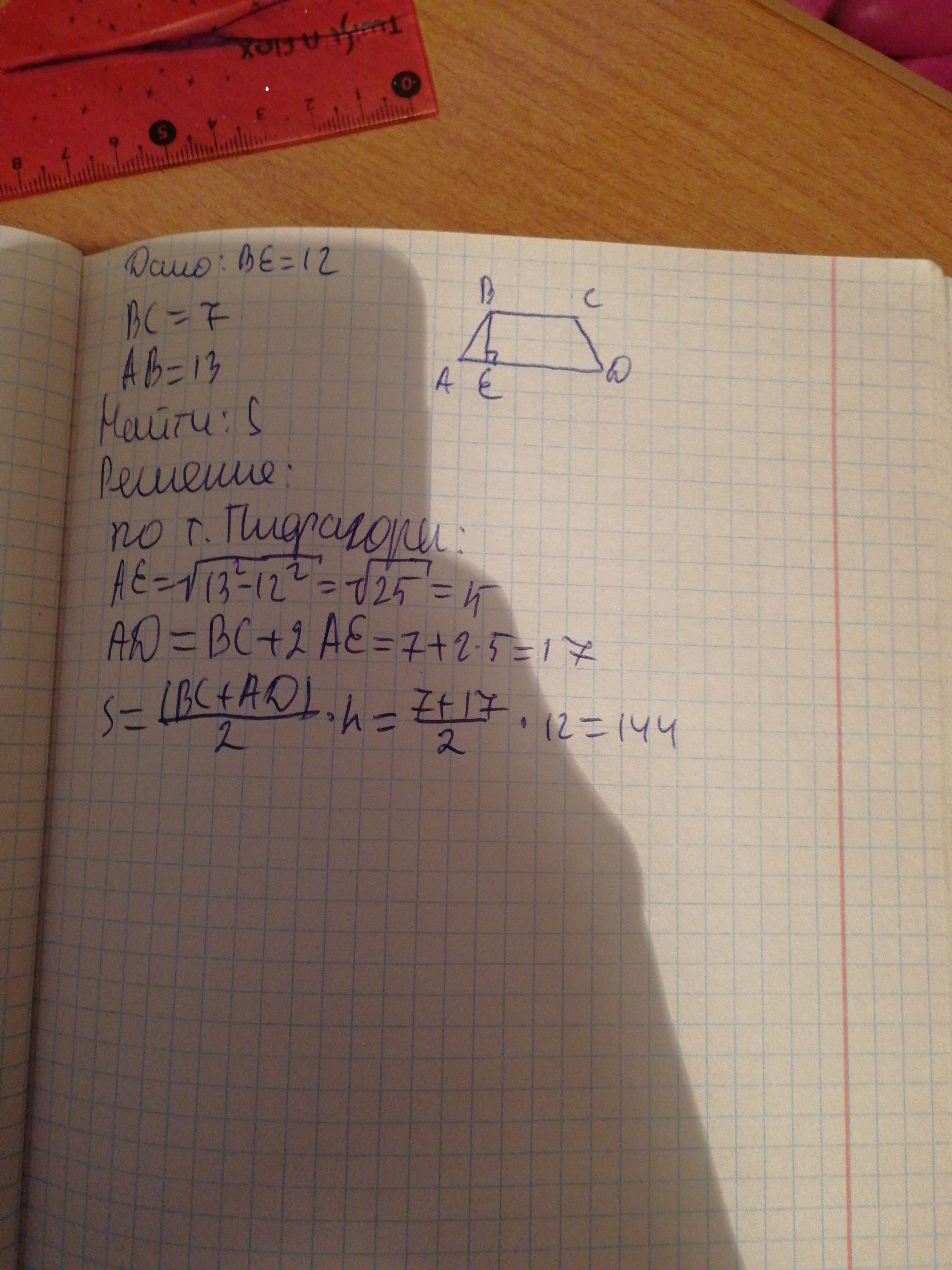 найдите площадь равнобедренной трапеции если ее меньшее основание равно 7 см боковая сторона 13 см высота 12 см