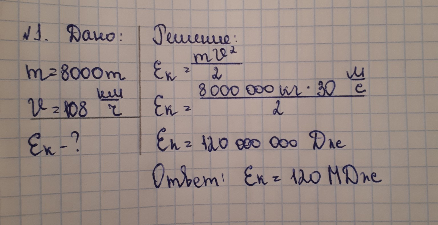 1. Вычислить кинетическую энергию поезда массой 8000 т, движущийся со скоростью 108 км / ч.