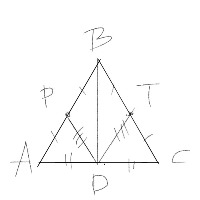 В равнобедренном треугольнике ABC точки P и Т- середины боковых сторон AB и BC соответственно. BD- медиана треугольника. Докажи,что