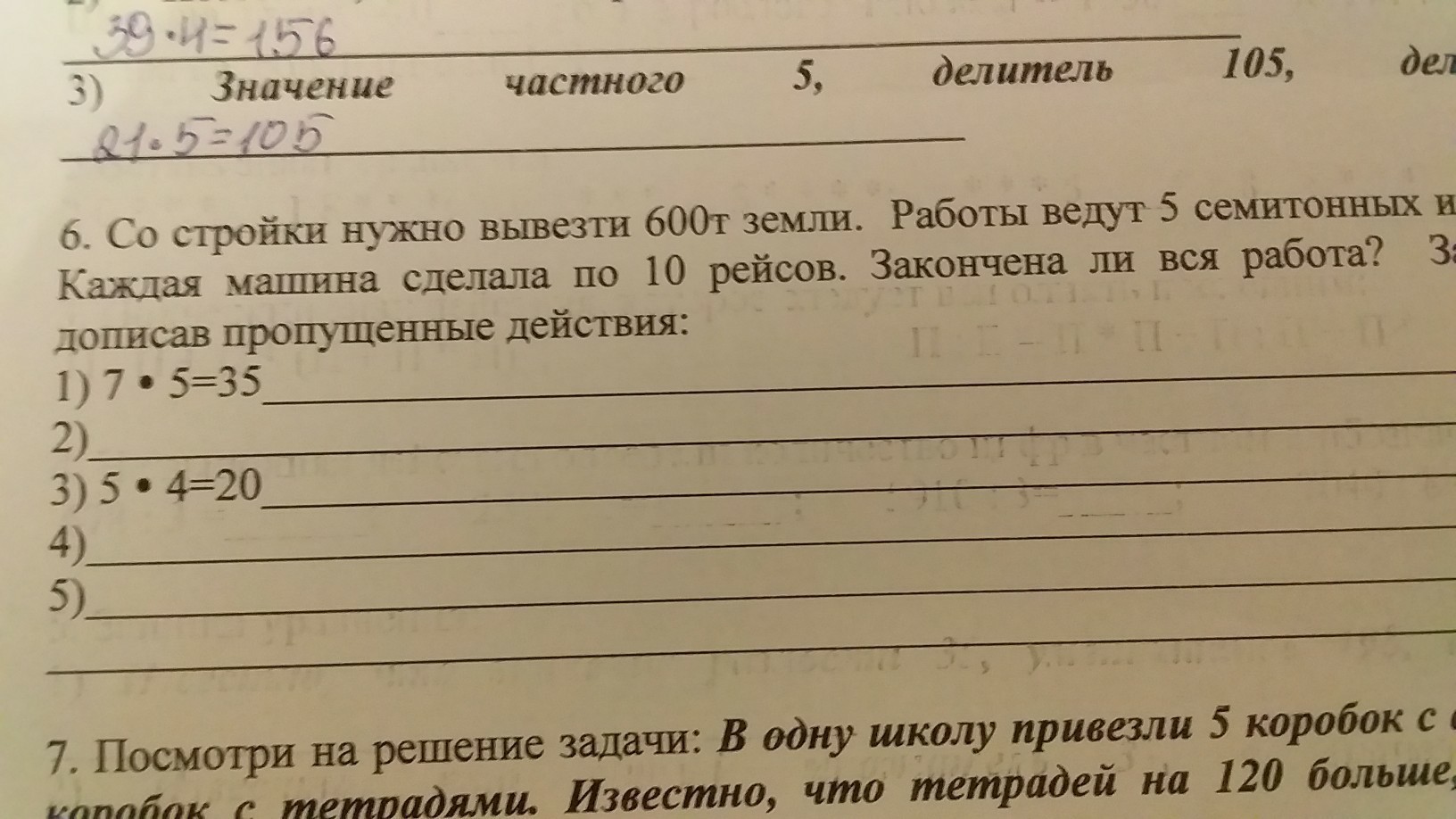 Со стройки нужно вывезти 600т земли.Работы ведут 5 семитонных и 4 пятитонные машины.Каждая машина сделала по 10 рейсов.Закончена ли вся работа?Запиши решение задачи,дописав пропущенные деййствия:Вот фото