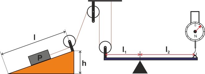 Какой величины потребуется сила F для перемещения груза, вес которого P=1008Н, если высота наклонной плоскости h=0,8 м, длина наклонной плоскости l=5,6 м, плечи рычага l1=1,4 м и l2=4,2 м?