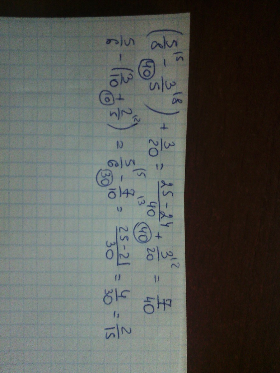 5/6-(3/10+2/5)=5/6-(3+4)/10=5/6-7/10=(50-42)/60=8/60=2/15