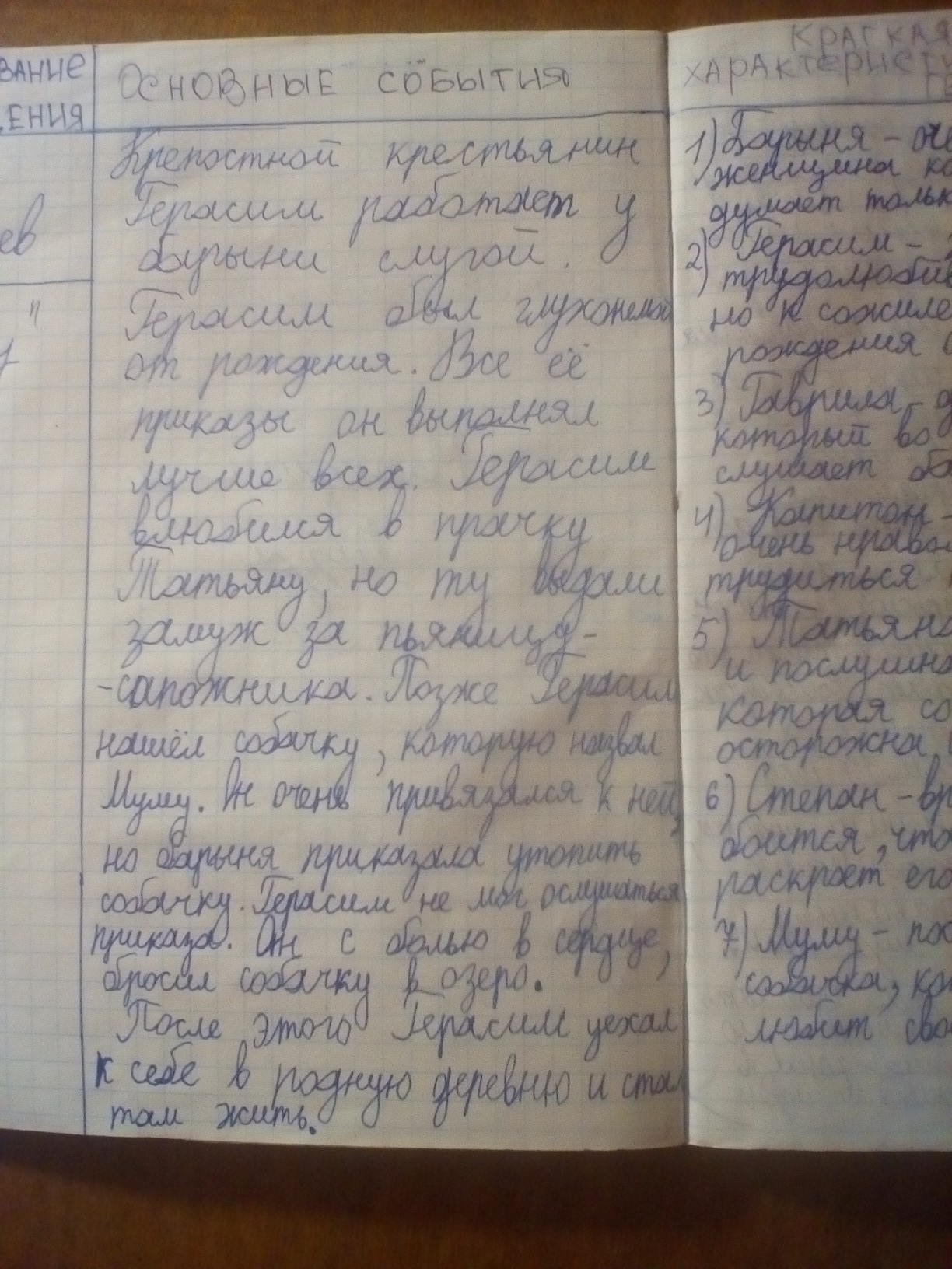 Главный герой рассказа - крепостной крестьянин Герасим, глухонемой с детства. Герасим - мужчина средних лет, высокий и очень сильный. Окружающие боятся Герасима за его богатырскую силу. Герасим живет и работает в деревне всю свою жизнь. Хозяйкой Герасима является старая капризная московская барыня. Однажды барыня преводит Герасима из деревни в Москву и назначает дворником