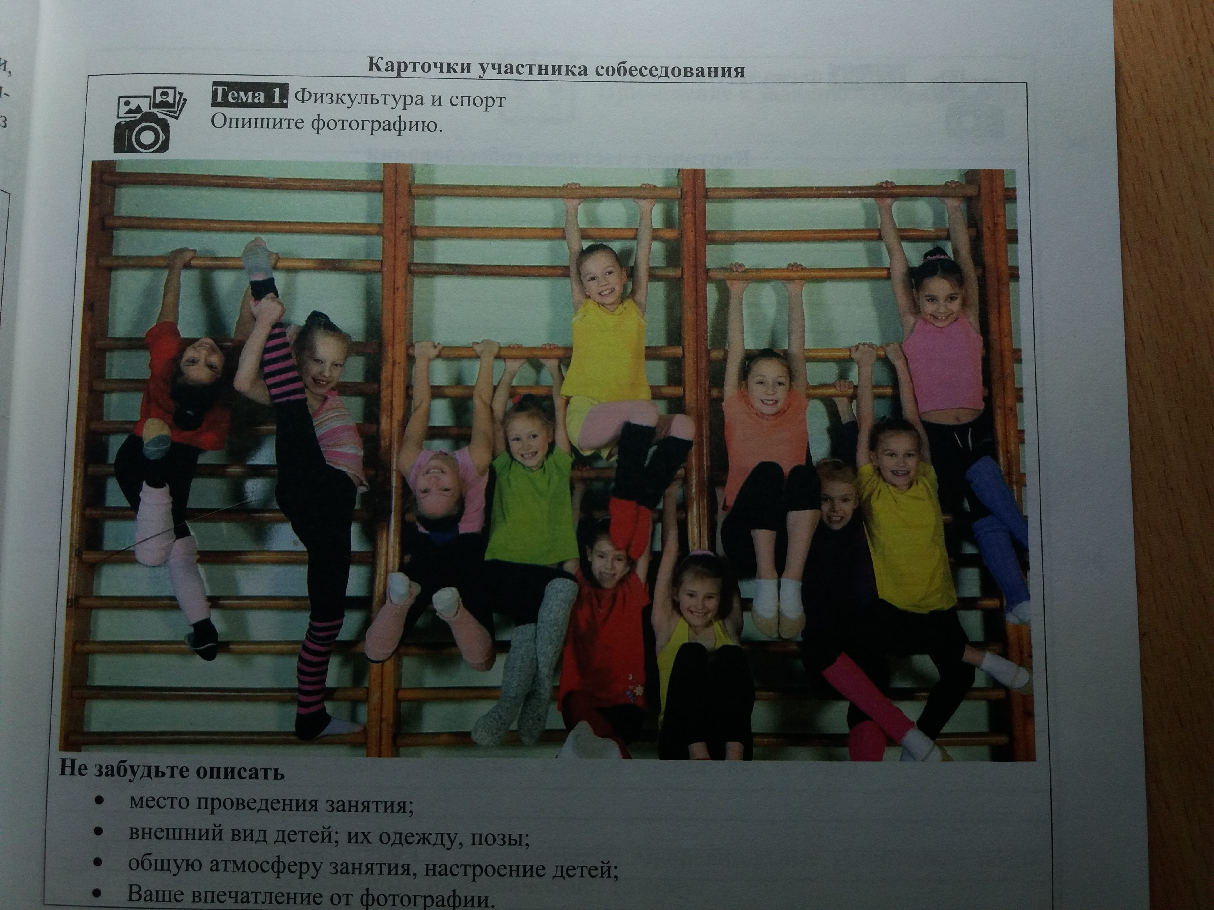 Место проведения занятий, явно находится в спортивном зале. Внешний вид у детей спортивная одежда т.к. находятся, опять повторюсь, в спортивном зале. Видно, что дети занимаются гимнастикой или что-то подобное. Общая атмосфера очень веселая видно, что детишки очень хорошие. Мое впечатление очень положительное т.к. на фото видно что дети развиваются, занимаются физической культурой, а не как в наше время сидят за компьютерами.