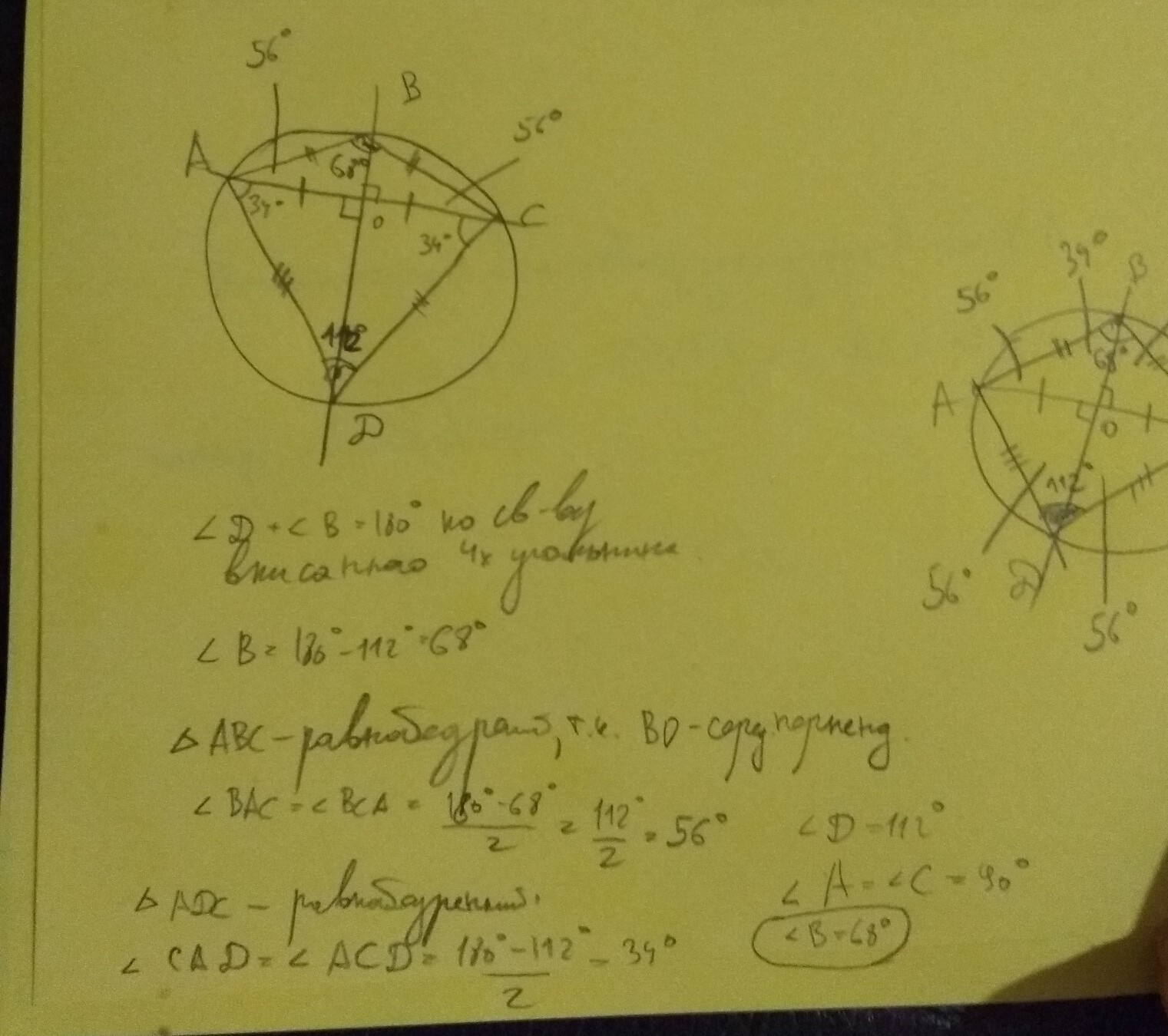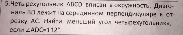 Четырехугольник ABCD Вписан в окружность. Диагональ BD Лежит на середина перпендикулярен к отрезку AC. Найти меньшие угол четырёх угольника, если угол ADC = 112 градусам