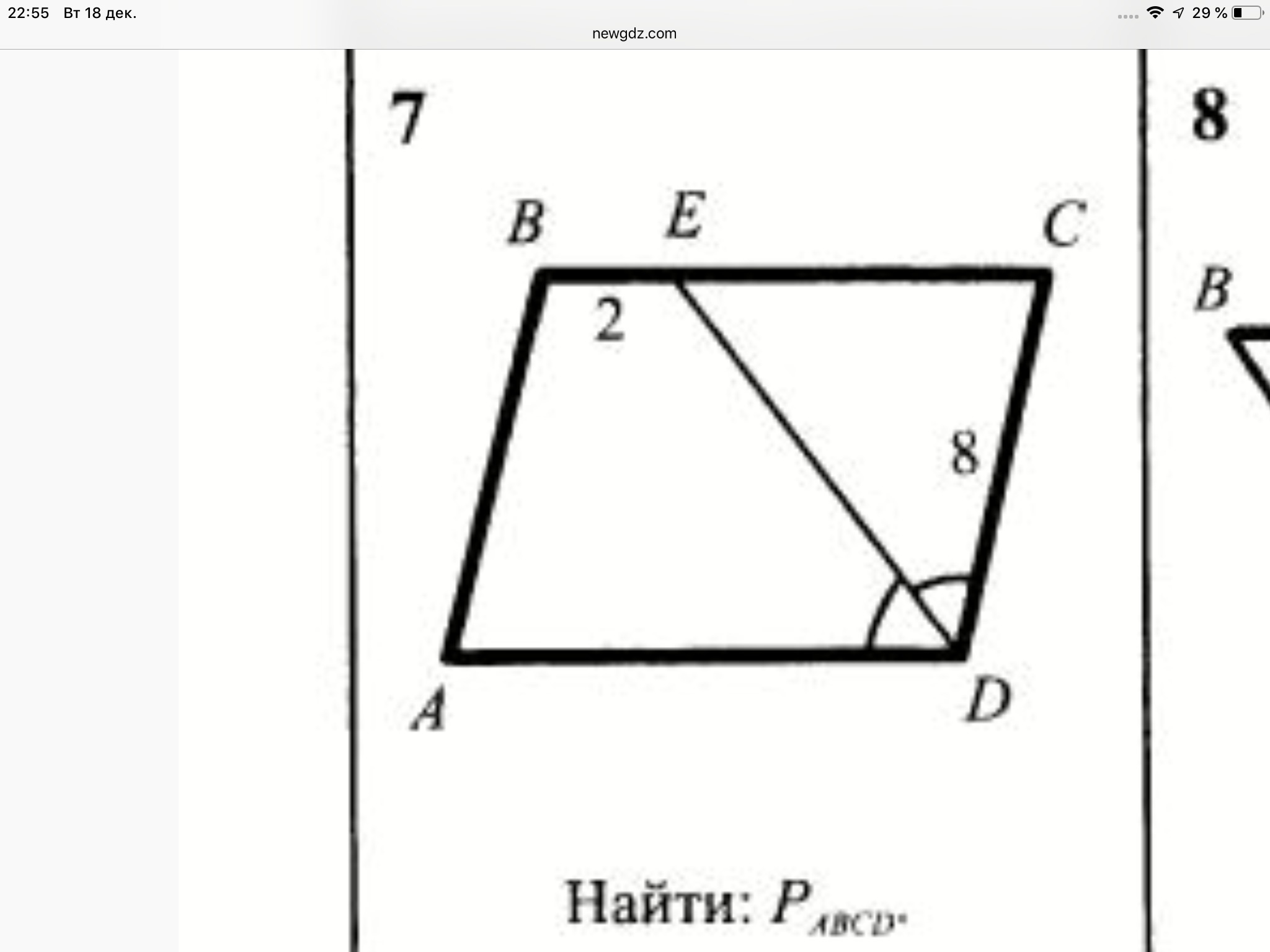 ABCD- параллелограмм.AB=CD=8 см. BE=2 см. Угол CED=углу EDA как накрест лежащие при параллельных BC AD и секущей ED, тогда треугольник ECD- равнобедренный с основание ED, тогда EC=CD=8 см , тогда BC=8+2=10 см , тк ABCD - параллелограмм то BC=AD=10 см ,AB=CD=8 см.Найдём периметр P=2 (AB+BC)=2(8+10)=2*18 =36 см