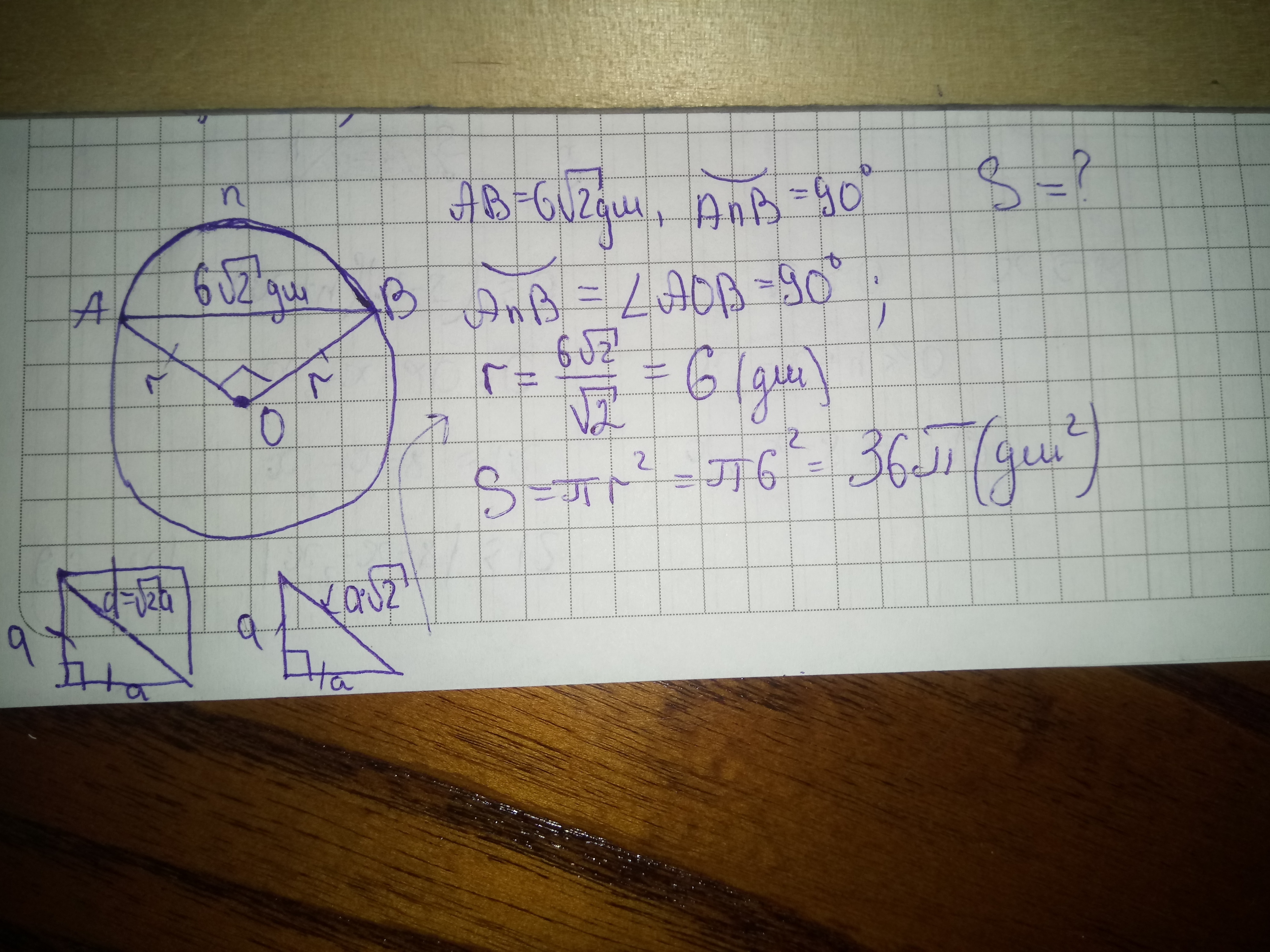 хорда окружности равна 6 корней из 2 дм и стягивает дугу в 90 градусов.Найти площадь круга. (с картинкой пожалуйста)