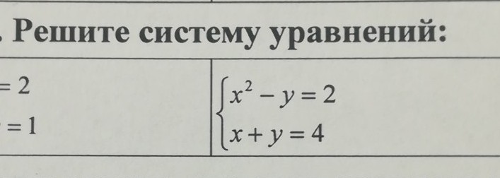 y=4-x. подставляем в 1 уравнение системы: x^2-(4-x)=2 ; x^2+x-4-2=0; x^2+x-6=0; D=1^2-4*1*(-6)=1+24=25; x1=(-1-5)/2, x2=(-1+5)/2. x1= -3, x2=2. y1=4-(-3)=4+3=7. y2=4-2=2. Ответ:( -3: 7), (2: 2).