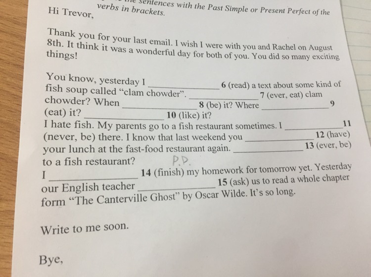 I haven’t finished my homework to tomorrow yet. Yesterday our English teacher asked us to read a whole chapter for "The canterville ghost" by Oskar Wilde. It's so long.