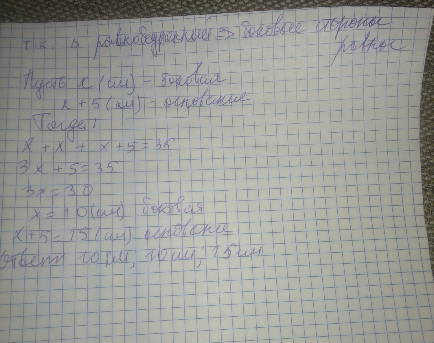 Периметр равнобедренного треугольника равен 35 см . Найдите стороны треугольника если боковая сторона равна на 5 см меньше основа