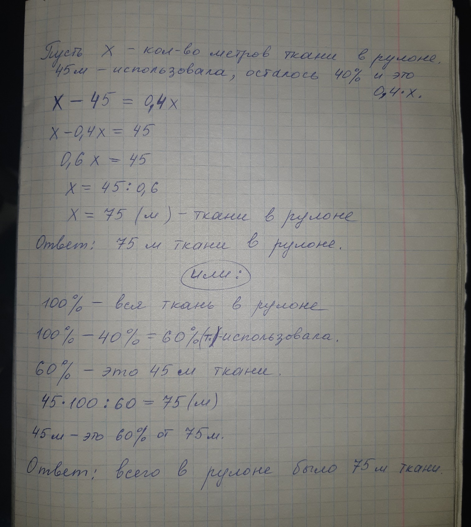Ирина использовала 45м ткани от всего количесства в рулоне, и у неё осталость 40%. Сколько всего ткани в рулоне?