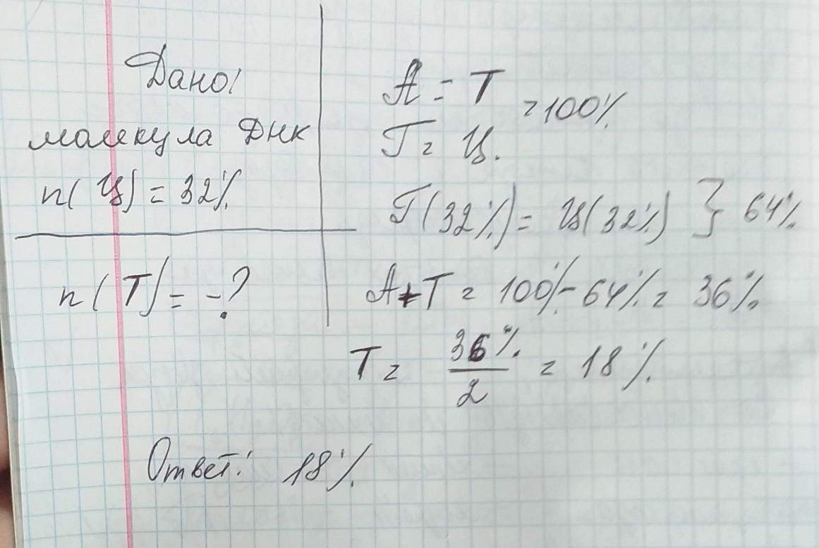 В молекуле ДНК содержание цитидиловых нуклеотидов составляет 32% от общего количества нуклеотидов. Определите процентное содержание тимидиловых нуклеотидов, входящих в молекулу ДНК