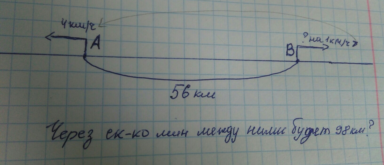 С двух аэродромов, расстояние между которыми 56 км, одновременно поднялись и полетели в противоположных направлениях два вертолета.Один вертолет летел со скоростью 4км/мин, скорость другого на 1 км/мин меньше.Через сколько минут расстояние между вертолетами будет 98 км?