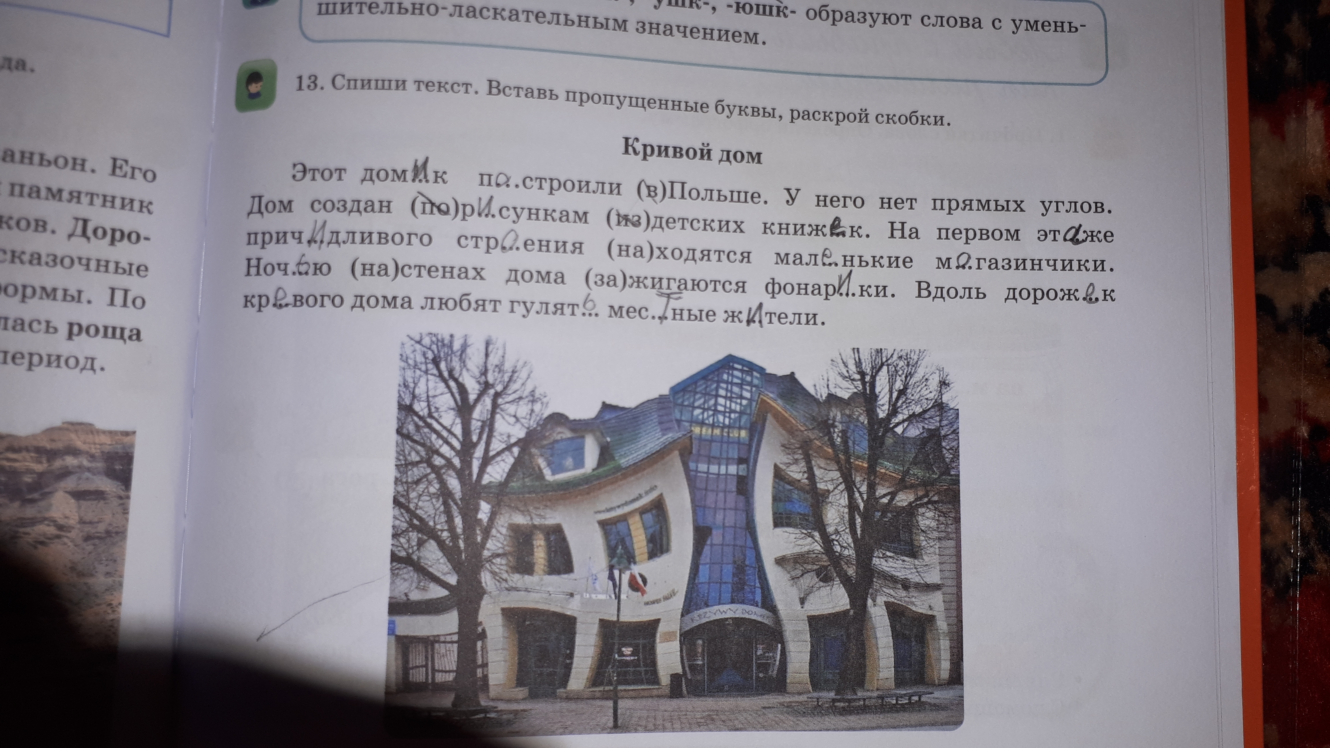 Этот домик построили в Польше. У него нет прямых углов. Дом создан по рисункам из детских книжек. На первом этаже причудливого строения находятся маленькие магазинчики. Ночью на стенах дома зажигаются фонарики. Вдоль дорожек кривого дома любят гулять местные жители.