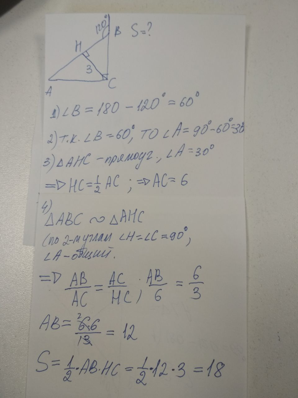 высота опущенная на гипотенузу прямоугольного треугольника равна 3 см и один из внешних углов равен 120градусов. найдите площадь этого треугольника