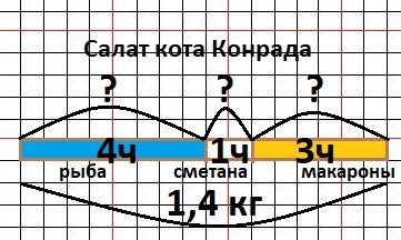 Кот Конрад решил приготовить 1,4 кг салата «вкусные макароны.рецепт этого салата выглядит следующим образом: 4 части копчёной рыбы, 1 часть сметаны ,3 часть макарон . Сколько граммов рыбы ,сметаны и макарон должен положить Конрад в салат