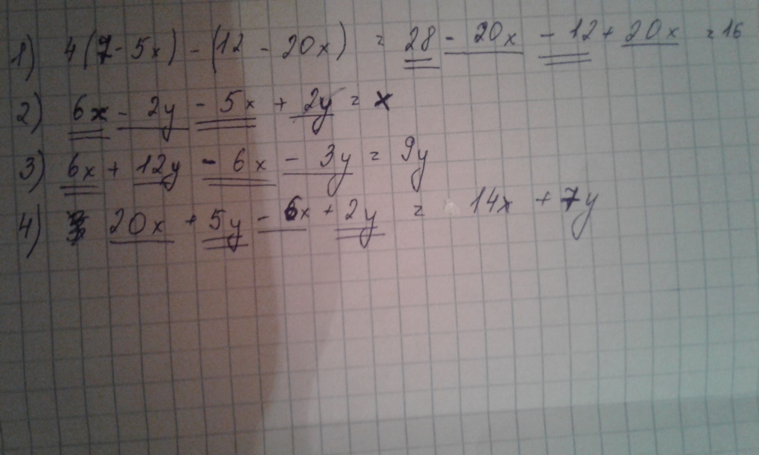 Помогите пожалуйста! Заранее спасибо! Раскройте скобки и приведите подобные слагаемые: 1)4(7-5х)-(12-20х); 2)2(3х-у)-(5х-2у);3)6(х+2у)-3(2х+у); 4)5(4х+у)-2(х-у)