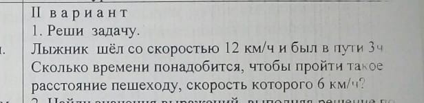 Лыжник шёл со скоростью 12 км/ч и был в пути 3ч. Сколько времени понадобится времени чтобы пройти такое расстояние пешеходу, скорость которого 6 км/ч