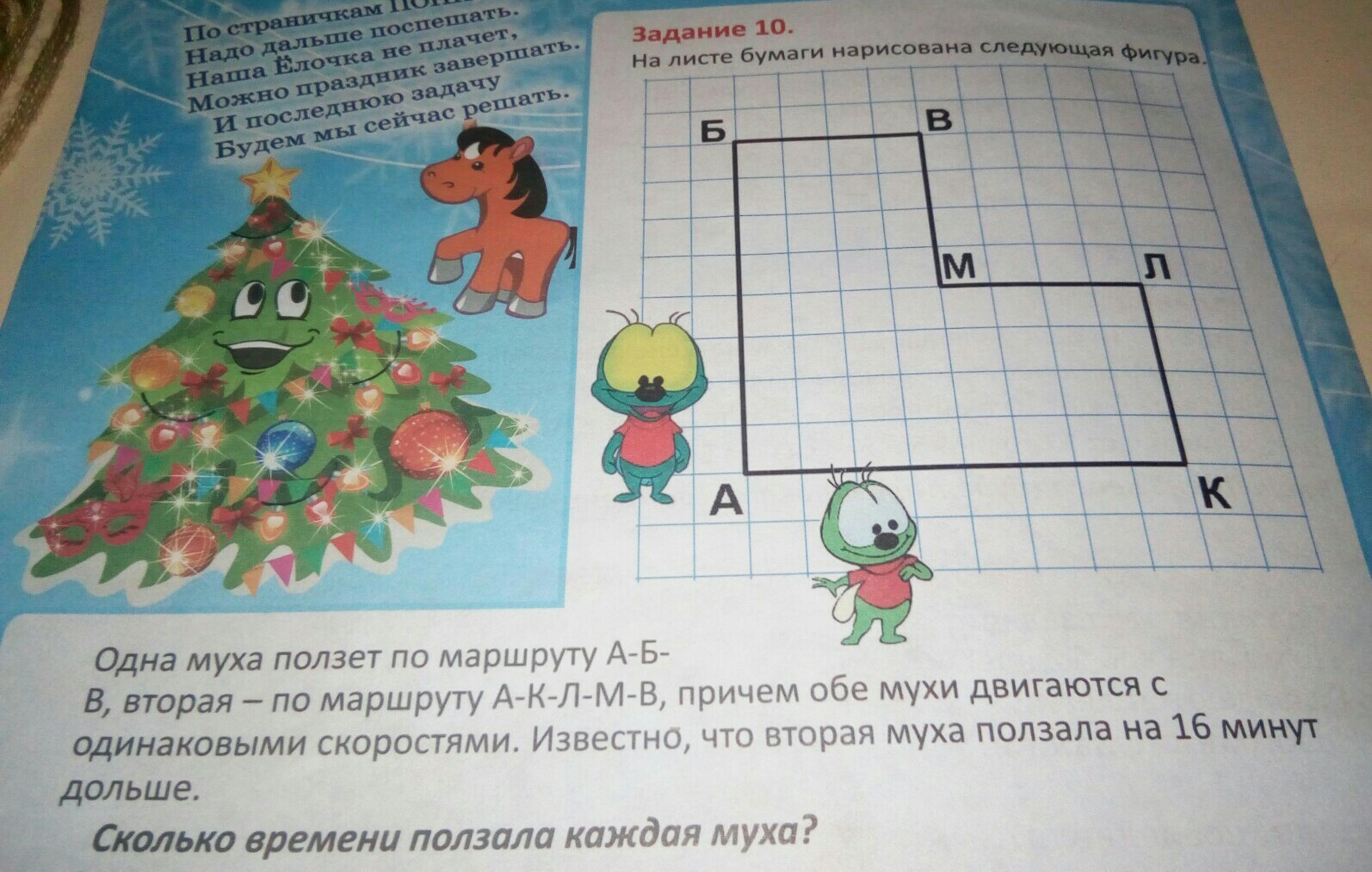 Вторая муха проползла на 8 клеток больше, причём ей понадобилось 16 минут. Осталось узнать скорость = 8 : 16 = 0,5 ( кл/ мин) - скорость мухи.