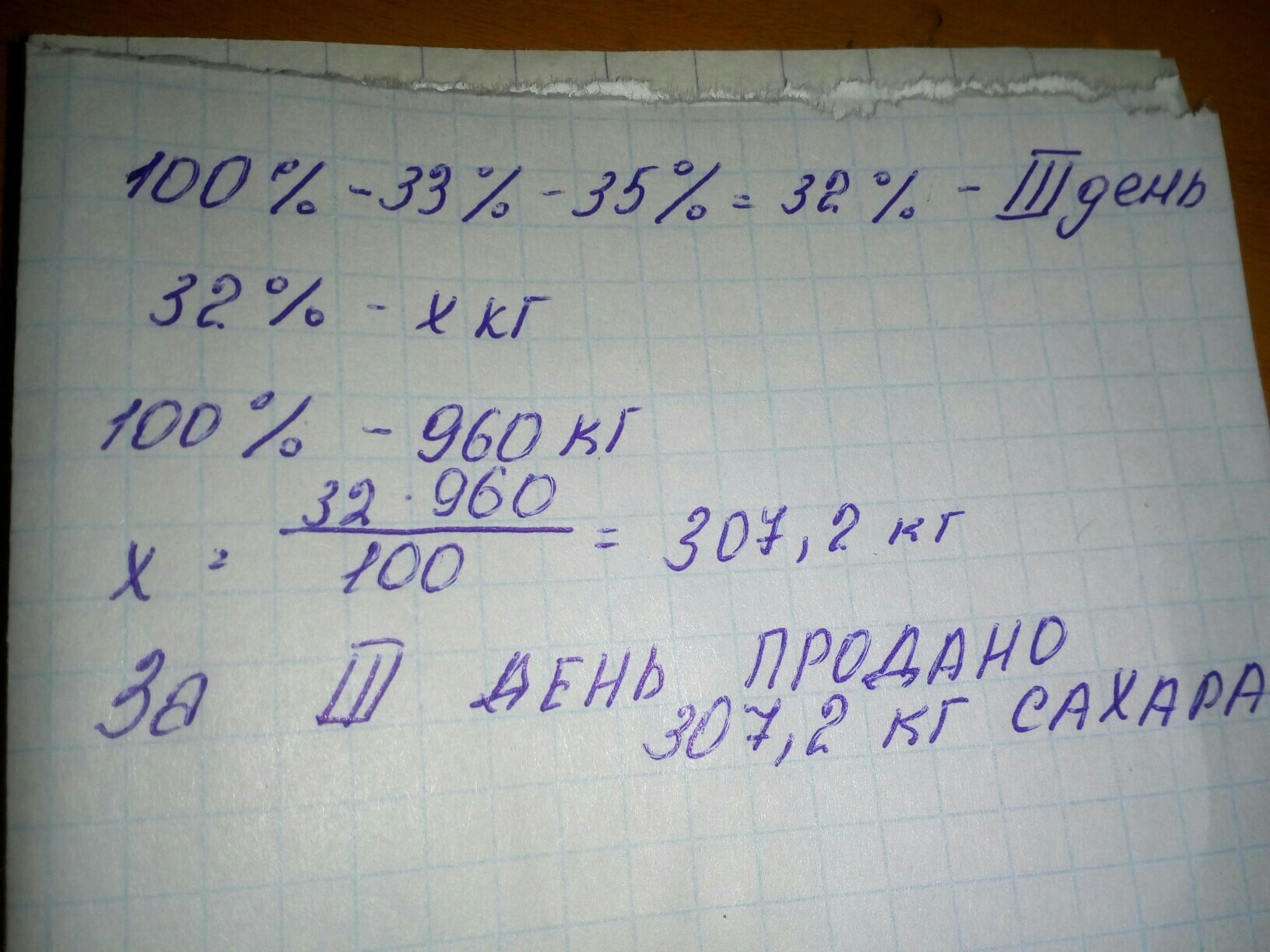 За 3 дня в магазине было продано 960кг сахара.В первый день было продано 33% от всего сахара во второй день 35% Сколько килограммов сахара было продано в третий день