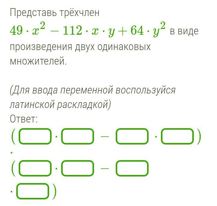 49 times  {x }^{2}  - 112 times x times y + 64 times  {y }^{2}  =  \  {(7x)}^{2}  - 2 times 7x times 8y +  {(8y)}^{2}  =  \  {(7x - 8y)}^{2}  = (7x - 8y)(7x - 8y)