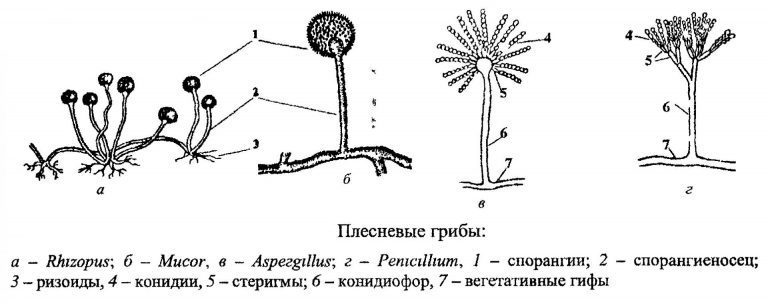 Тело подавляющего большинства грибов построено из тонких нитчатых образований — гиф. Совокупность их образует грибницу (или мицелий).Разветвляясь, мицелий образует большую поверхность, что обеспечивает всасывание воды и питательных веществ. Условно грибы делятся на низшие и высшие. У низших грибов гифы не имеют поперечных перегородок и мицелий представляет собой одну сильно разветвлённую клетку. У высших грибов гифы разделены на клетки. Дрожжи и грибы внутриклеточные паразиты, мицелия не имеют. Клетки большинства грибов покрыты твёрдой оболочкой, её нет у зооспор и вегетативного тела некоторых простейших грибов. В цитоплазме гриба содержатся структурные белки и не связанные с органоидами клетки ферменты, аминокислоты, углеводы, липиды. Органоиды: митохондрии, лизосомы, вакуоли, содержащие запасные вещества — волютин, липиды, гликоген, жиры. Крахмала нет. В клетке гриба имеется одно или несколько ядер.